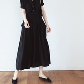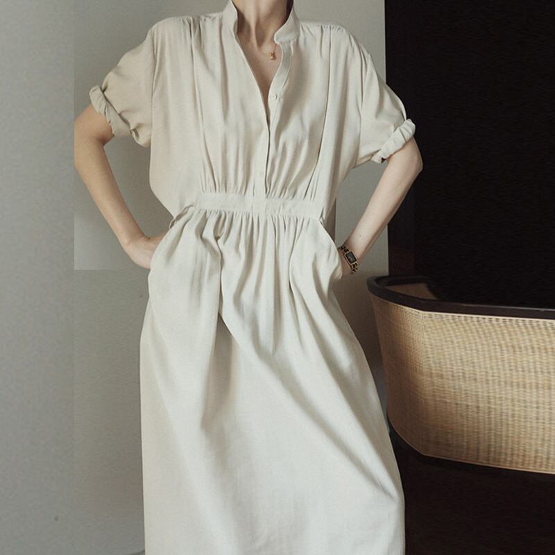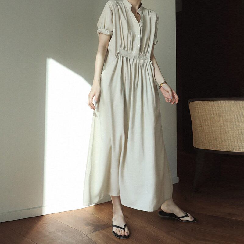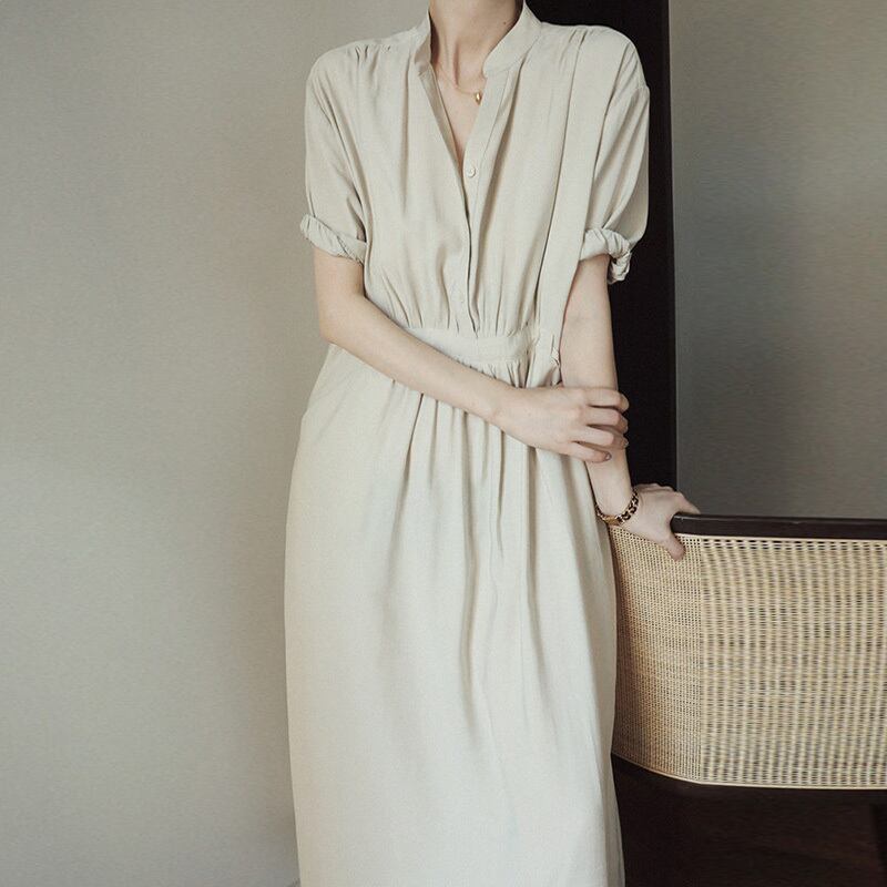 女性ファッションシンプルスタイルVネック無地半袖ゆったり着痩せ効果ロングデートワンピース【DL-2594】