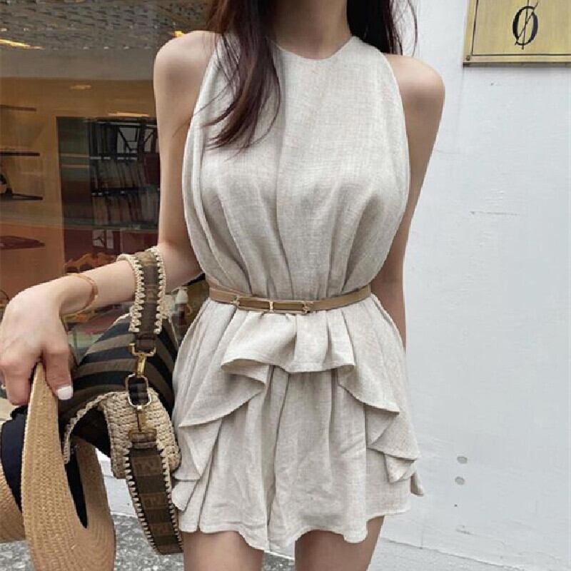 優しい雰囲気無地クルーネック不規則デザイントップス&無地ワイドレッグショーツセットアップ(ベルトなし)【DL-2596】