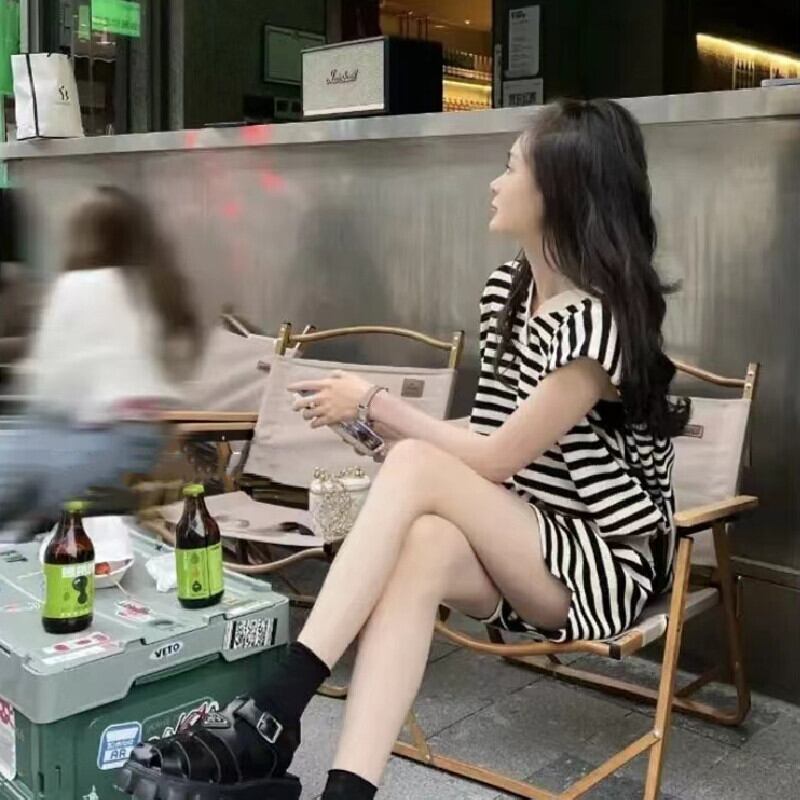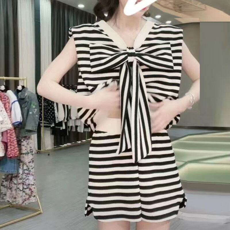 蝶結び付きVネックストライプベストトップス&ストライプショーツセットアップ【DL-2600】