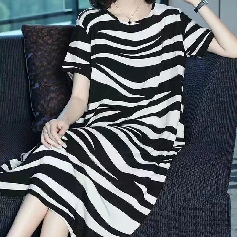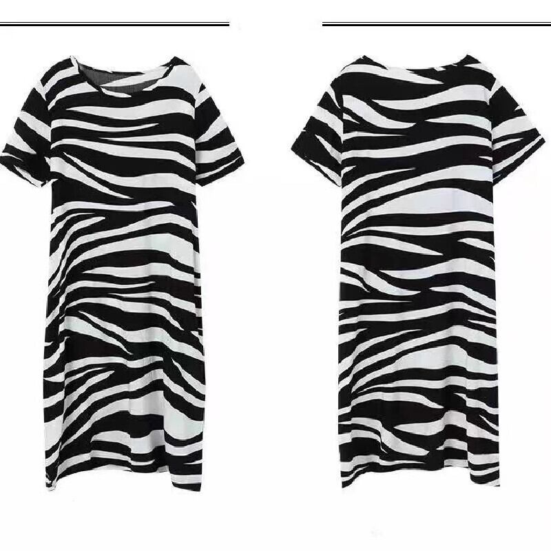 カジュアルゆったり着痩せ効果半袖ゼブラ柄気質ロングファッションワンピース【DL-2606】