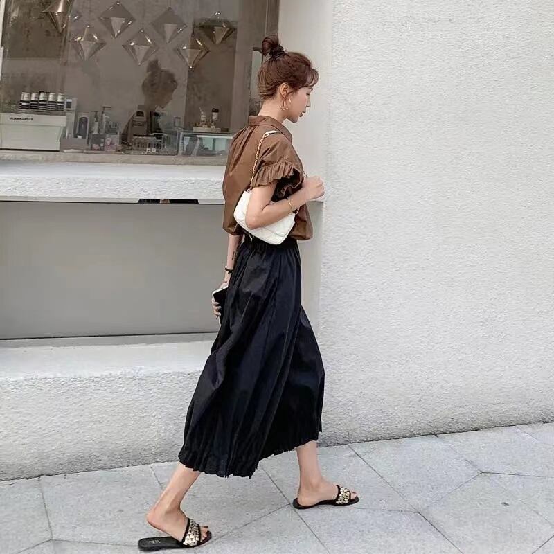 フリル裾フレンチ袖無地ゆったりシャツ・ブラウストップス&無地ワイドレッグパンツセットアップ【DL-2610】