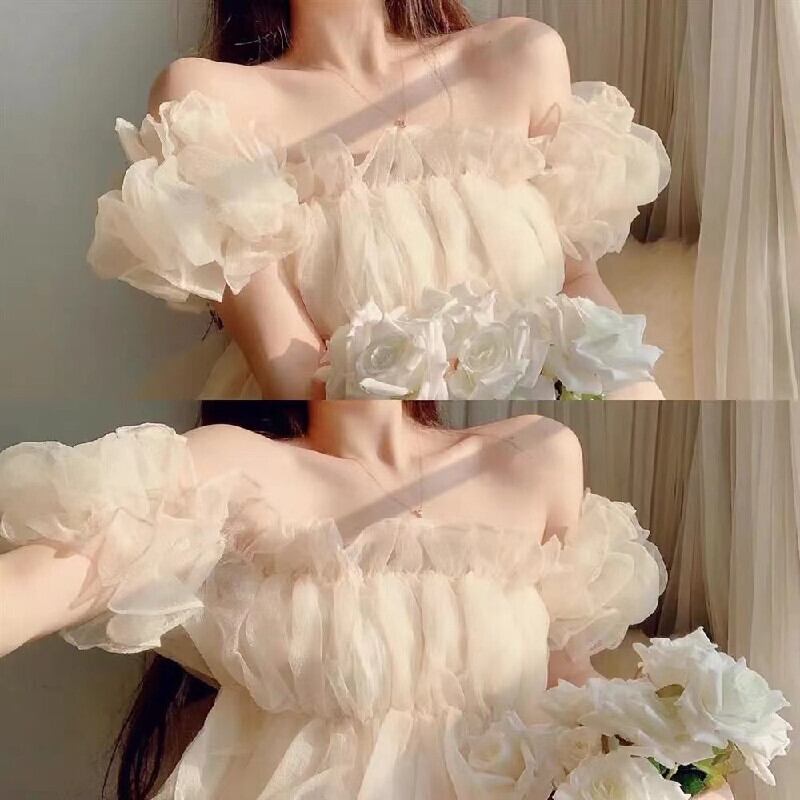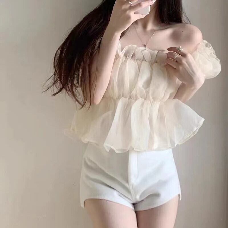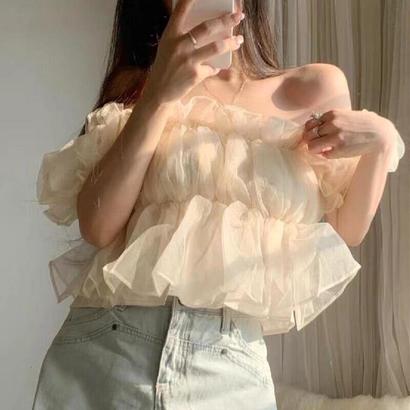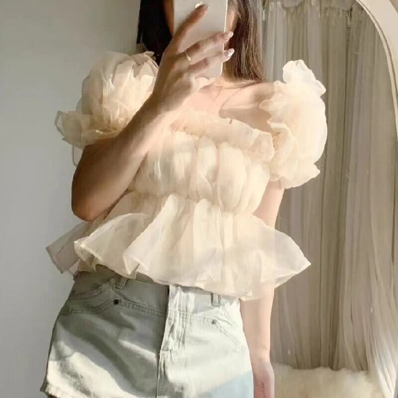 フランスファッションフリル裾ボートネックパフスリーブシャツ・ブラウストップス【DL-2616】