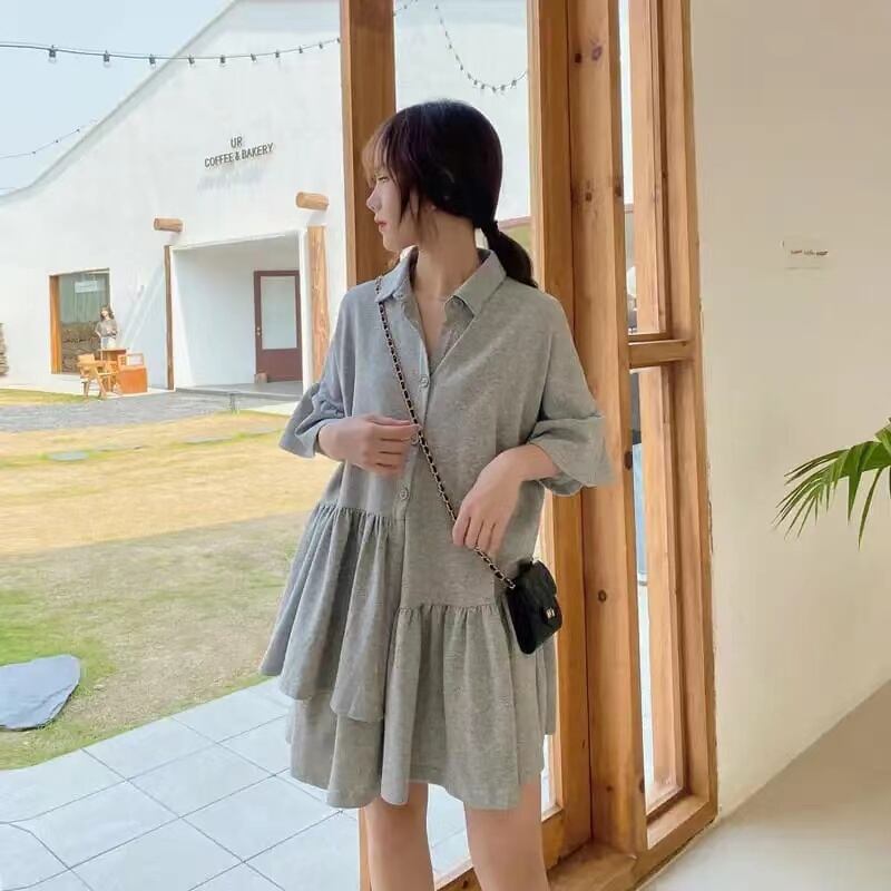不規則デザイン感レデイースファッション無地フリル裾半袖ゆったりカジュアルワンピース【DL-2620】