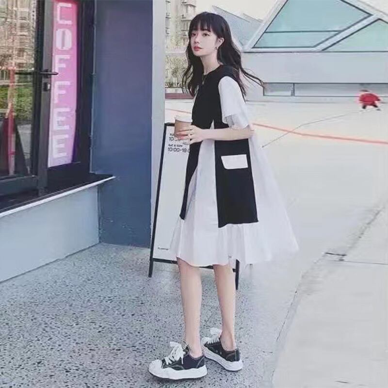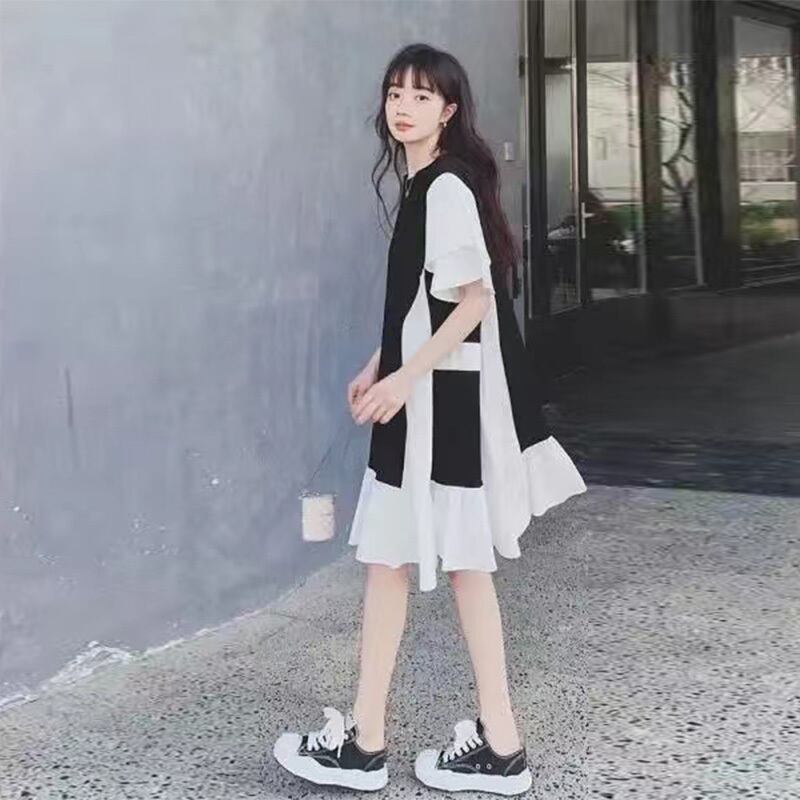 フリル裾配色切り替えデザイン高級感着痩せ効果ゆったりカジュアルワンピース【DL-2624】