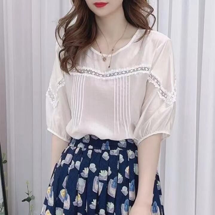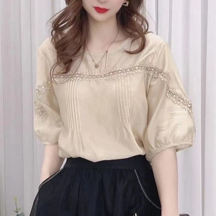 パールレース透かし彫りレトロデザイン飾るパフスリーブシャツ・ブラウストップス【DL-2625】