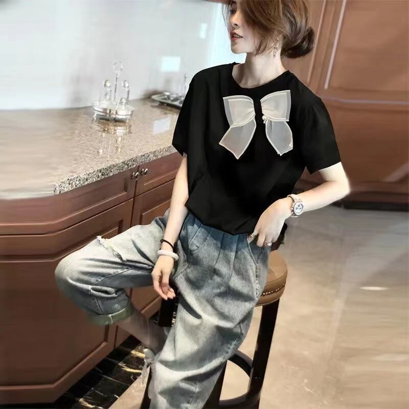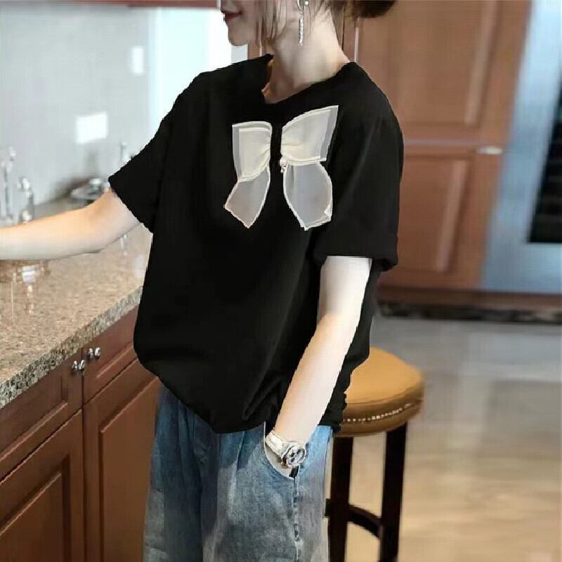 カジュアル蝶結び飾る切り替えデザイン感レデイースファッションTシャツトップス【DL-2627】
