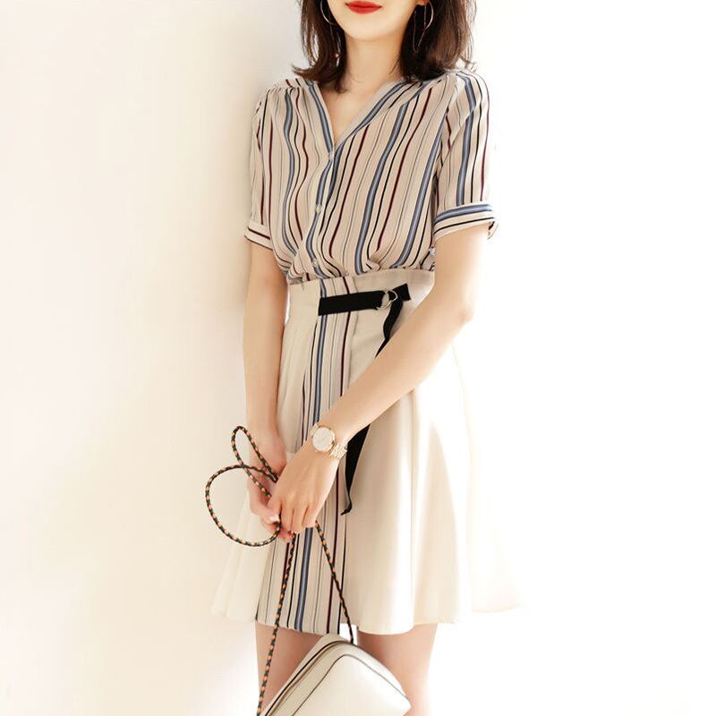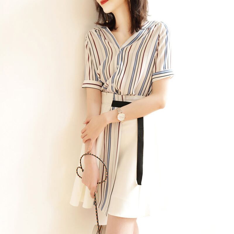 優しい気質ストライプシャツ・ブラウストップス&切り替えデザインスカートセットアップ【DL-2628】