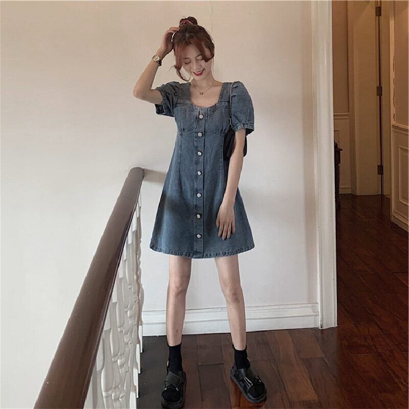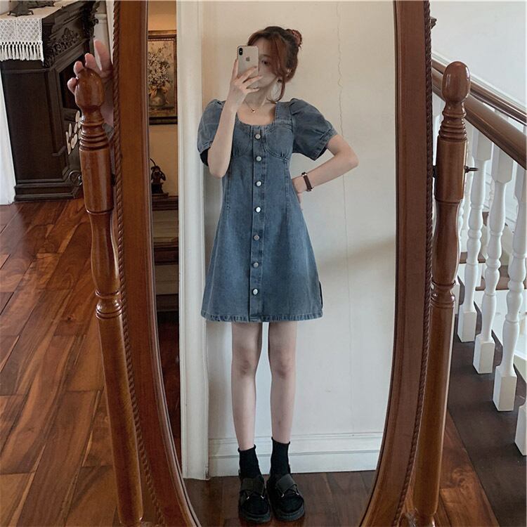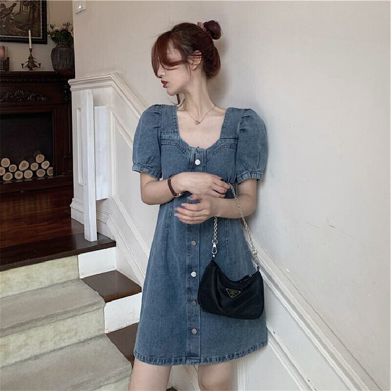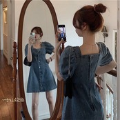 フランス気質ファッションパフスリーブ着痩せ効果デニムデートワンピース【DL-2631】