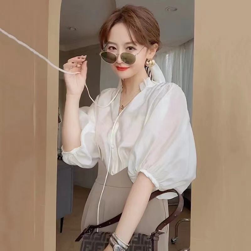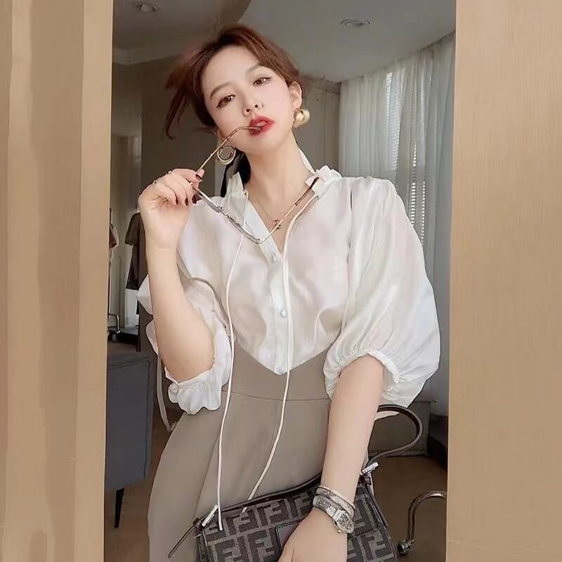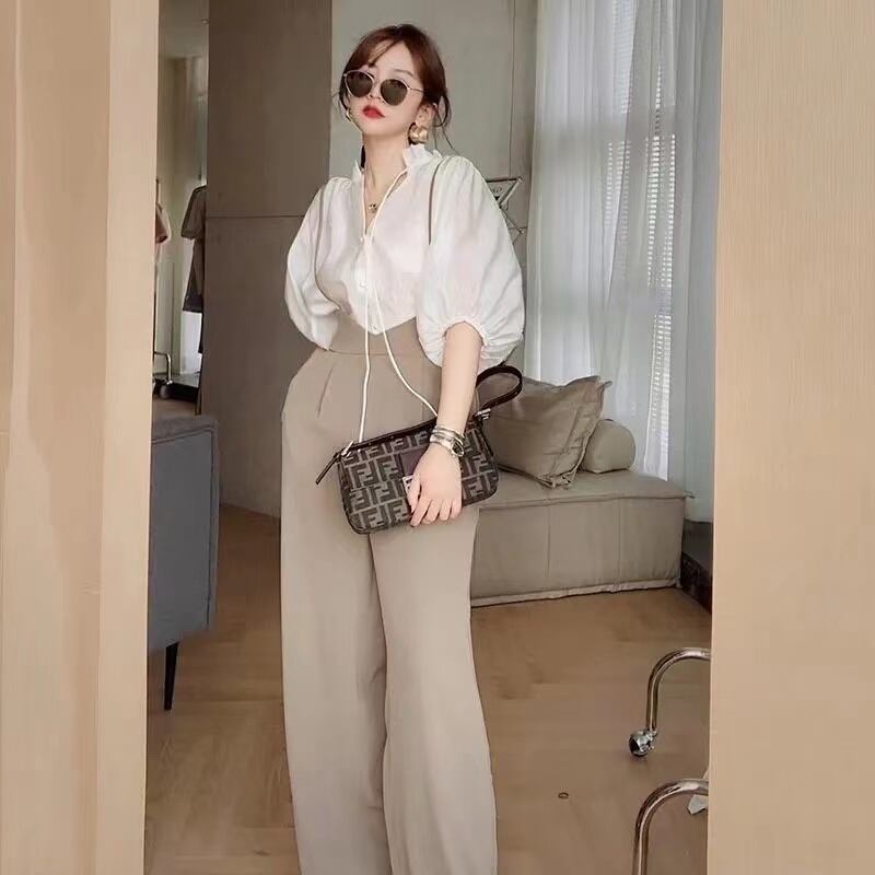ホワイト無地パフスリーブシャツ・ブラウストップス&無地ハイウエストロングオールインワン·サロペットセットアップ【DL-2661】