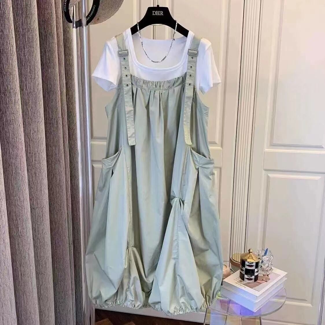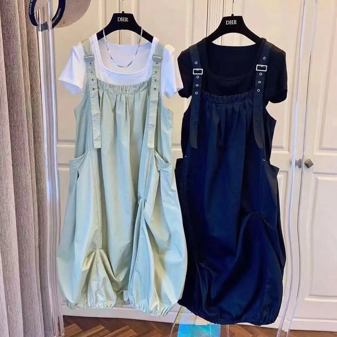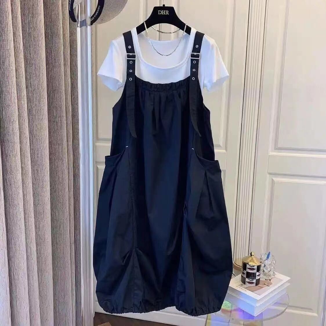 ホワイトコーデしやすいTシャツトップス&無地ストラップカジュアルワンピースセットアップ【DL-2679】
