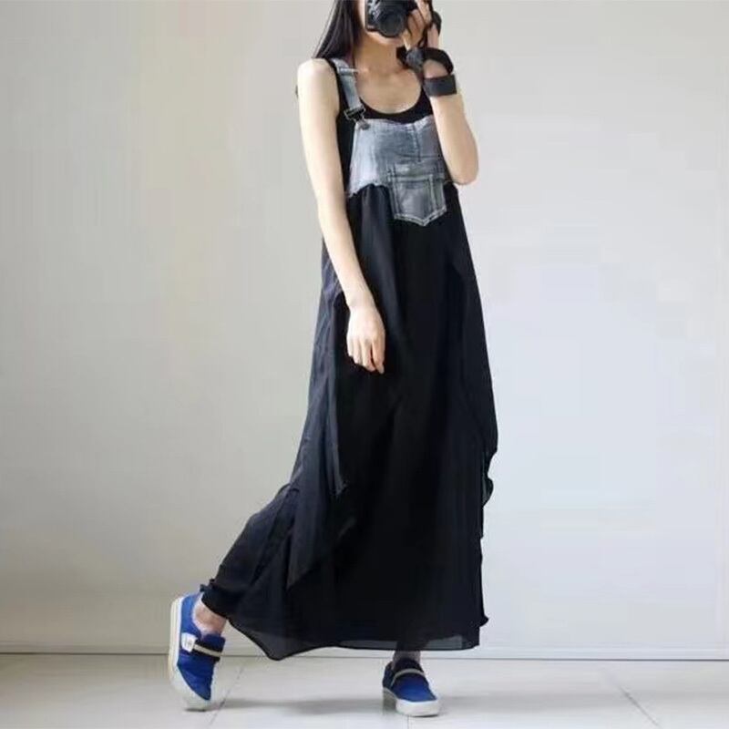 デニム不規則切り替えデザインスタイルシフォンゆったりカジュアルロングワンピース【DL-2680】