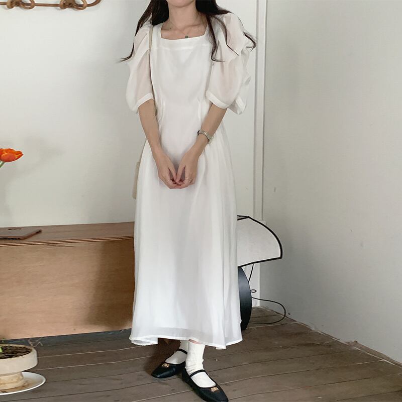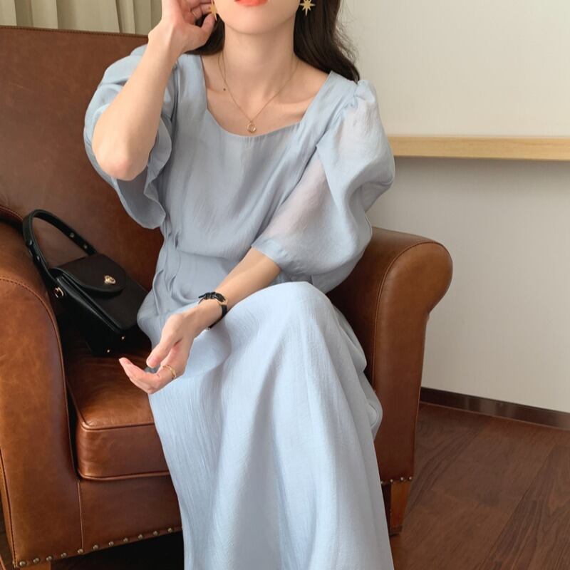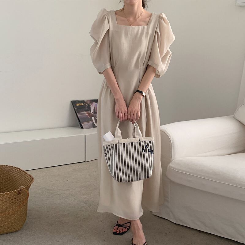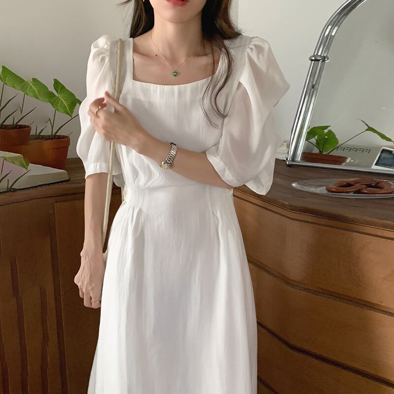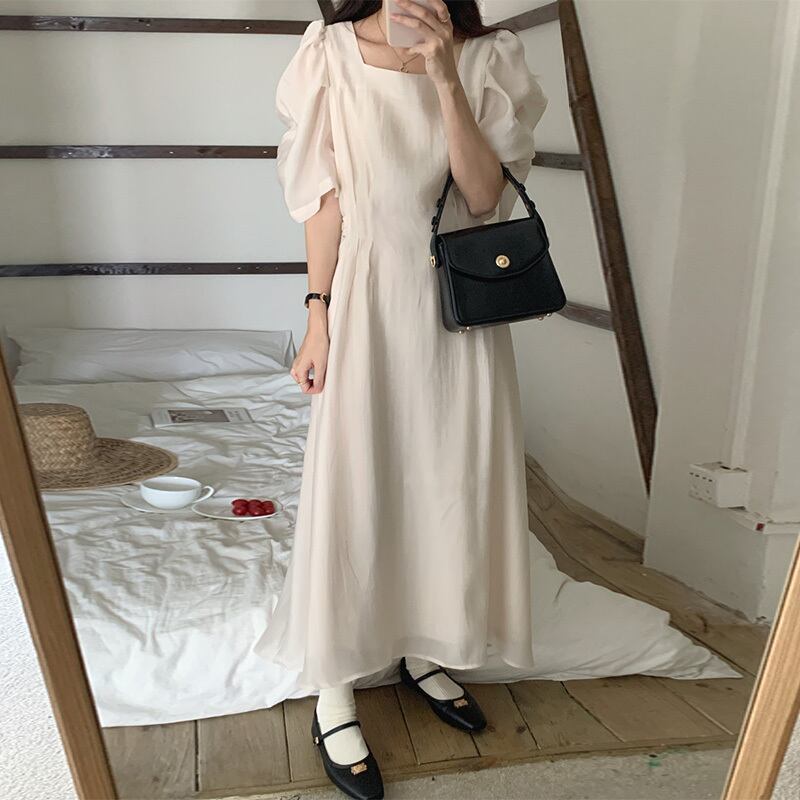 レトロデザイン感レデイースファッションシンプルパフスリーブデートワンピース【DL-2694】