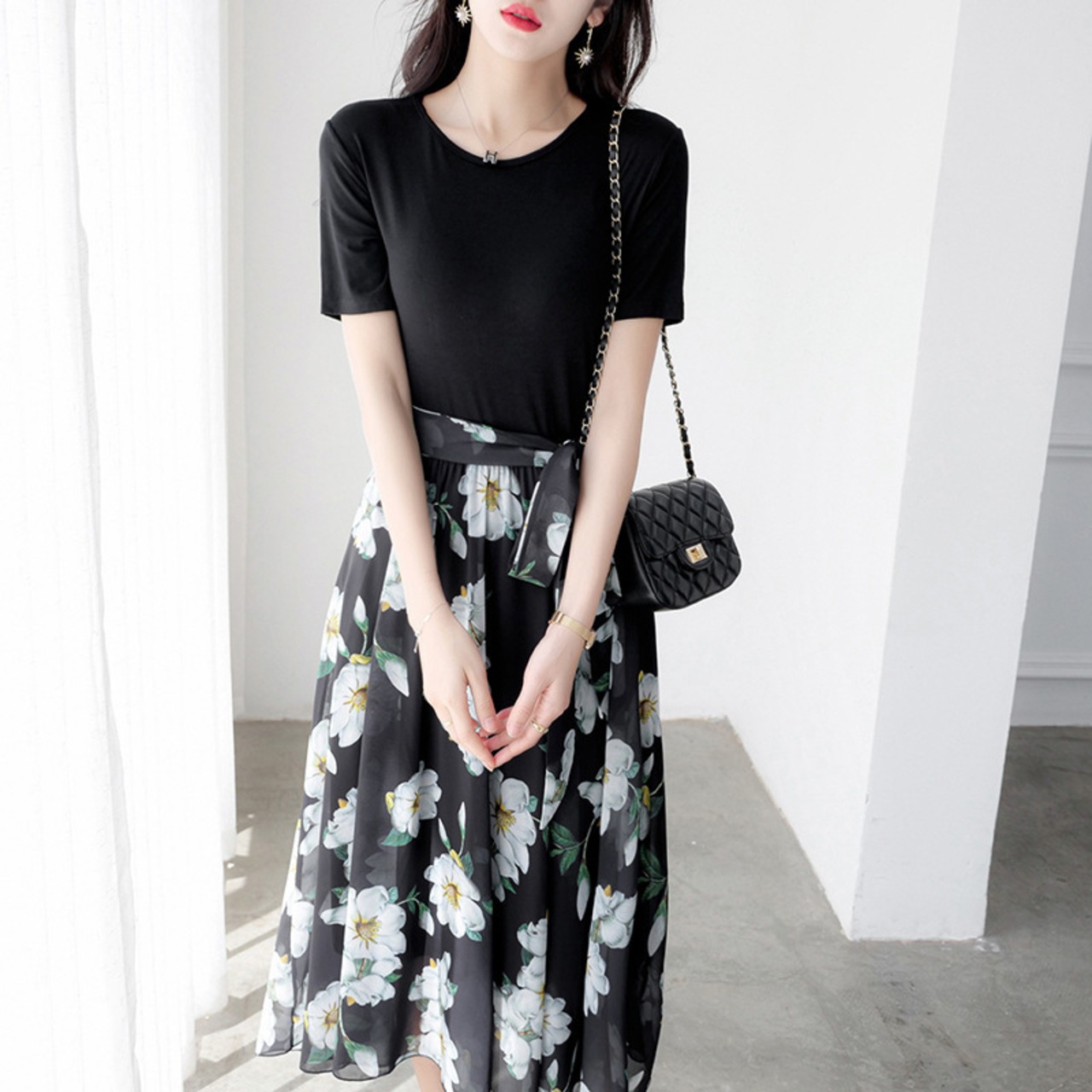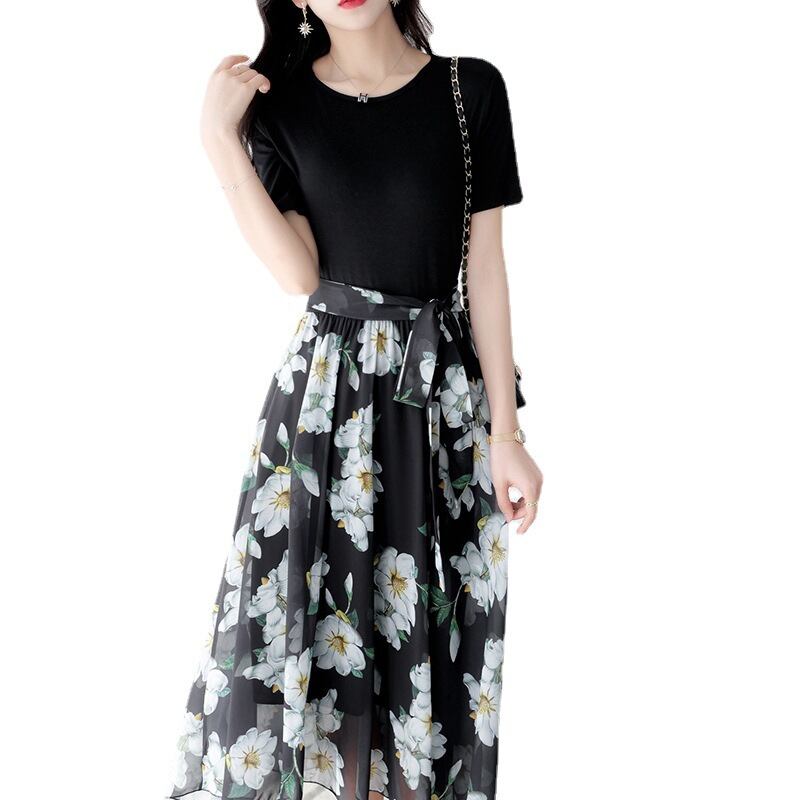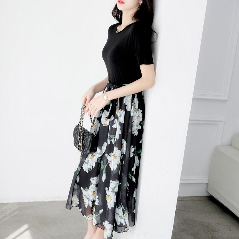 ブラックTシャツ切り替え花柄シフォンデートワンピース【DL-2703】