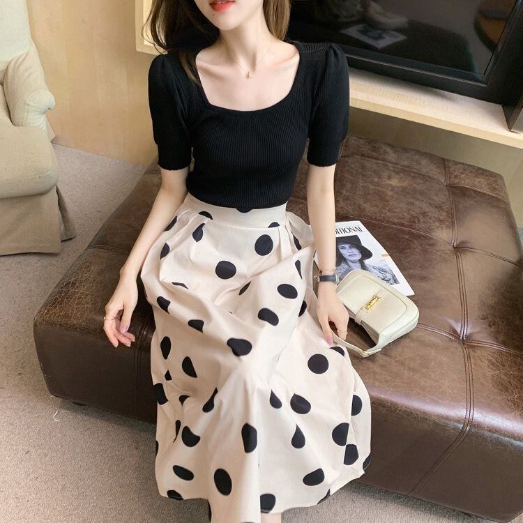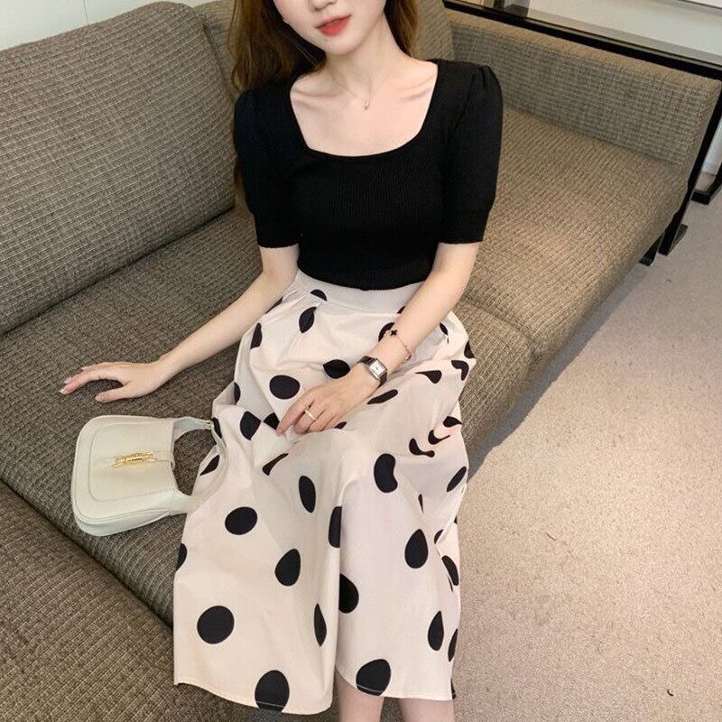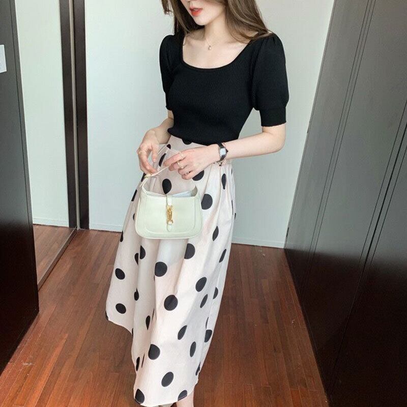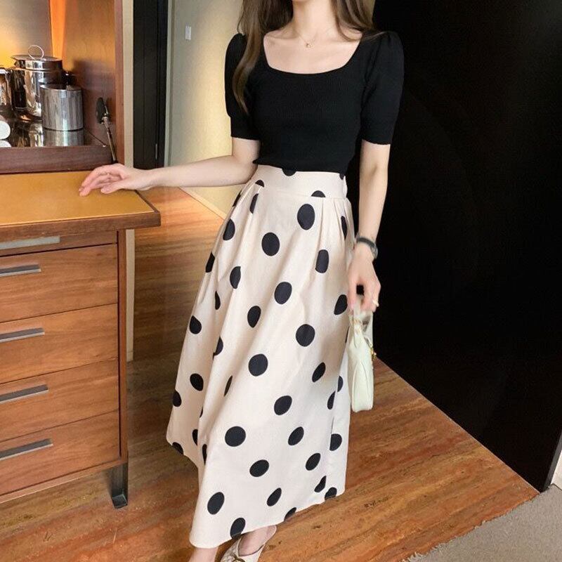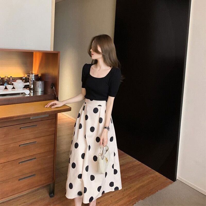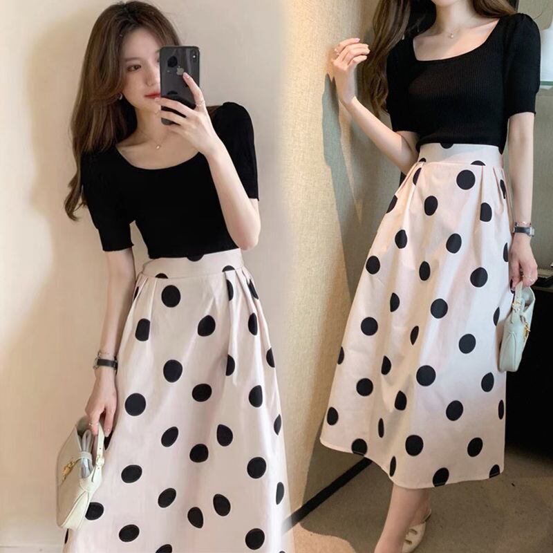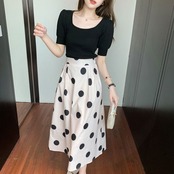 ブラック無地Tシャツ&アプリコット水玉ロングスカートセットアップ【DL-2712】