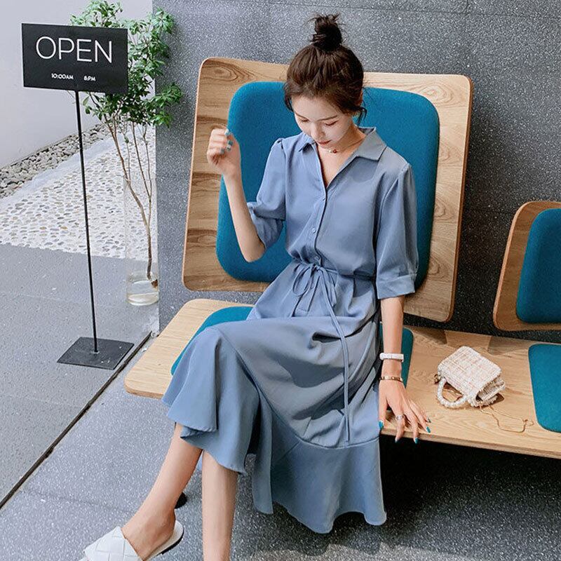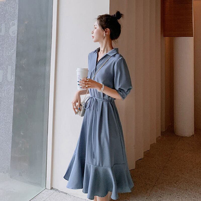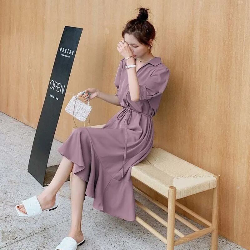 フリル裾切り替えVネック半袖ゆったりロングデートワンピース【DL-2717】