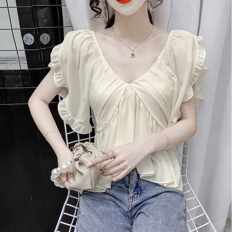 フリル裾フレンチ袖切り替えデザインシャツ・ブラウストップス【DL-2719】