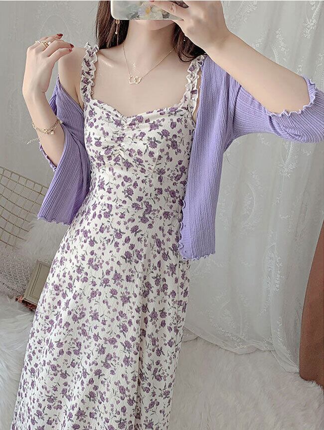 パープルカーディガン&花柄優しい気質スリップデートワンピースセットアップ【DL-2713】
