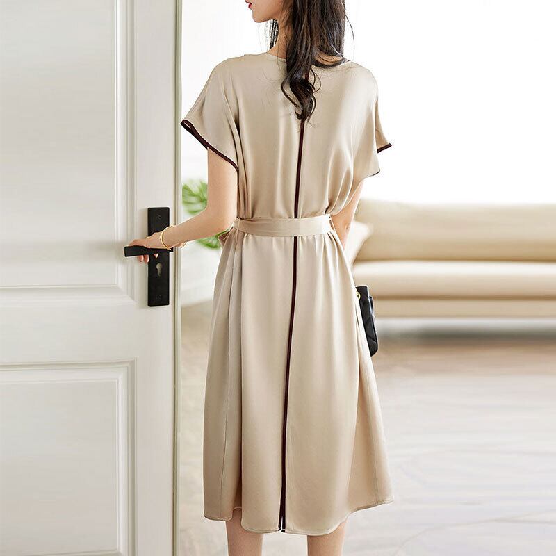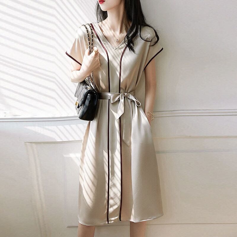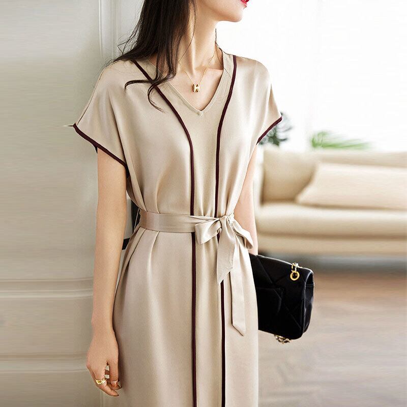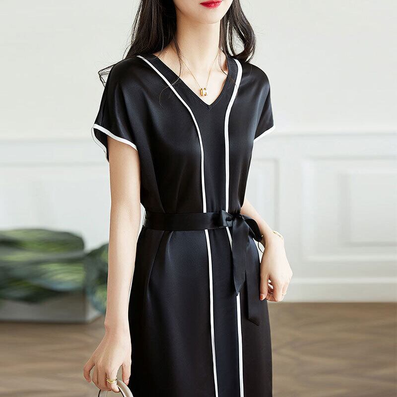 切り替えストライプフレンチ袖Vネックロングデートワンピース【DL-2721】