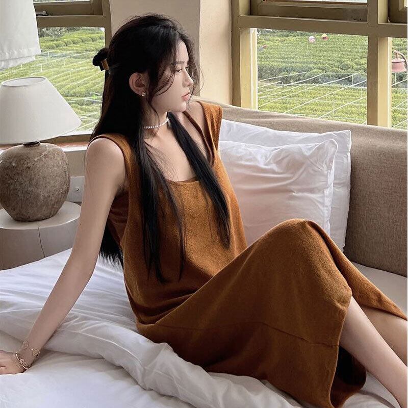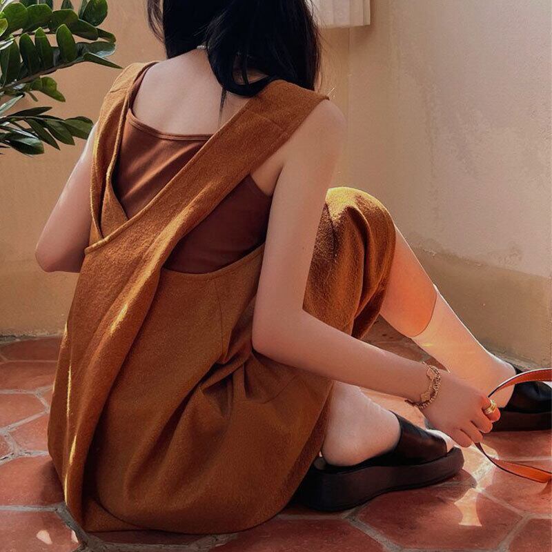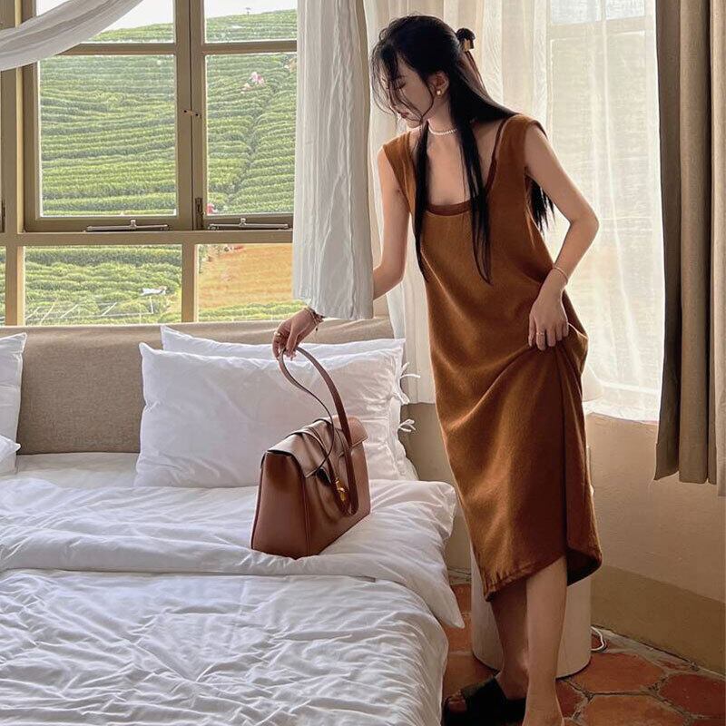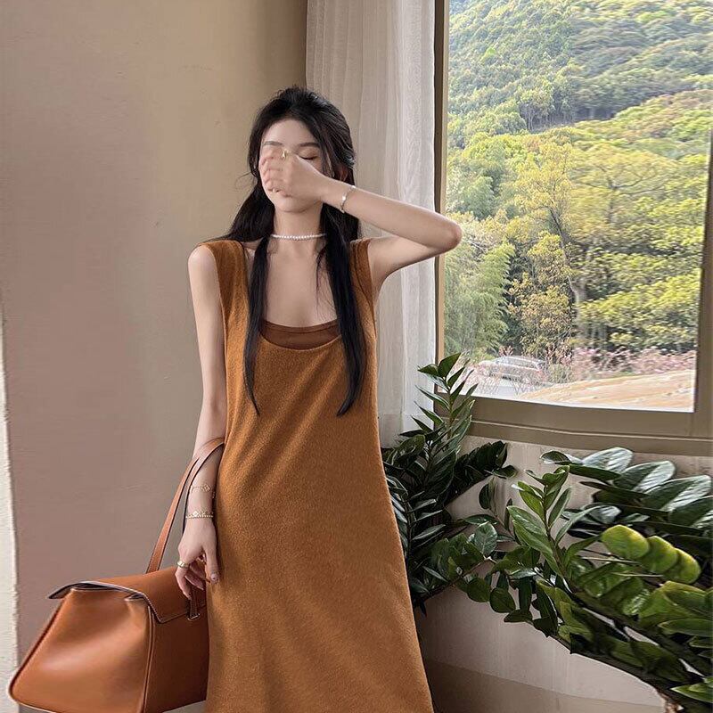 デザイン感レデイースファッションベストニットワンピース&無地キャミソールセットアップ【DL-2725】