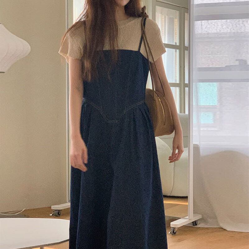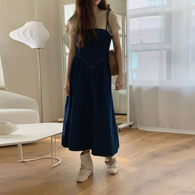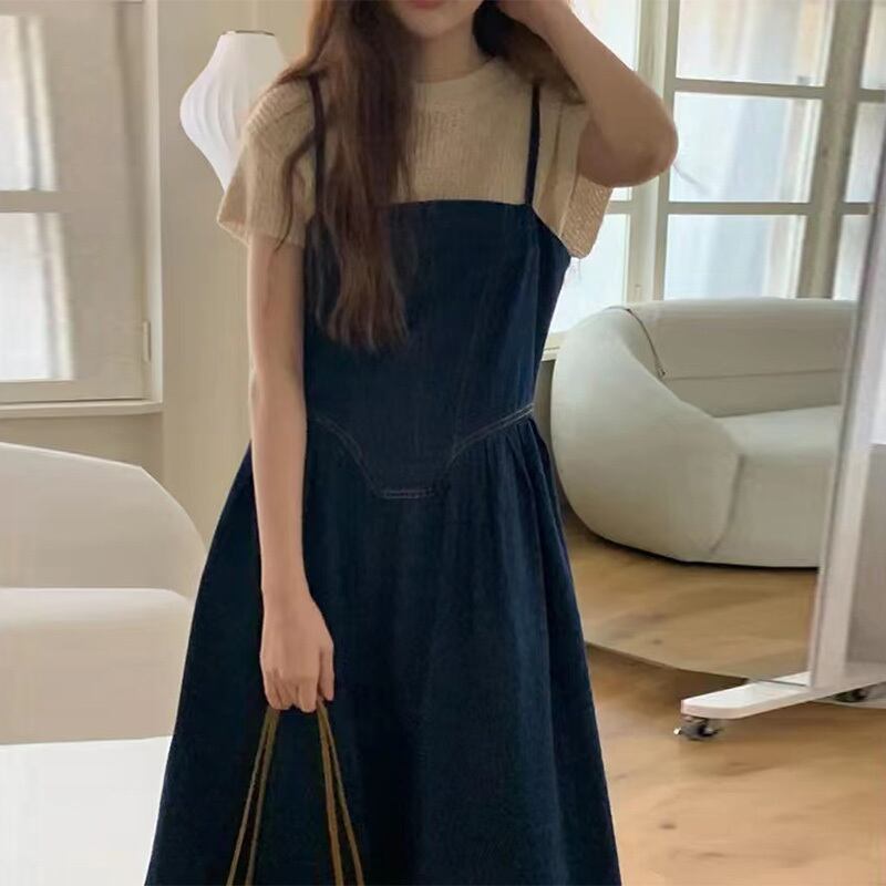合わせやすいニットセータートップス&無地ハイウエストデニムスリップカジュアルワンピース【DL-2726】