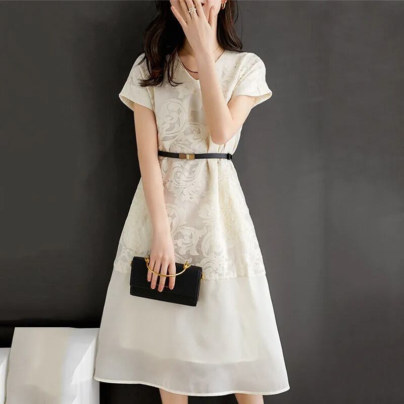 花柄レースVネック半袖ゆったりデートワンピース【DL-2734】