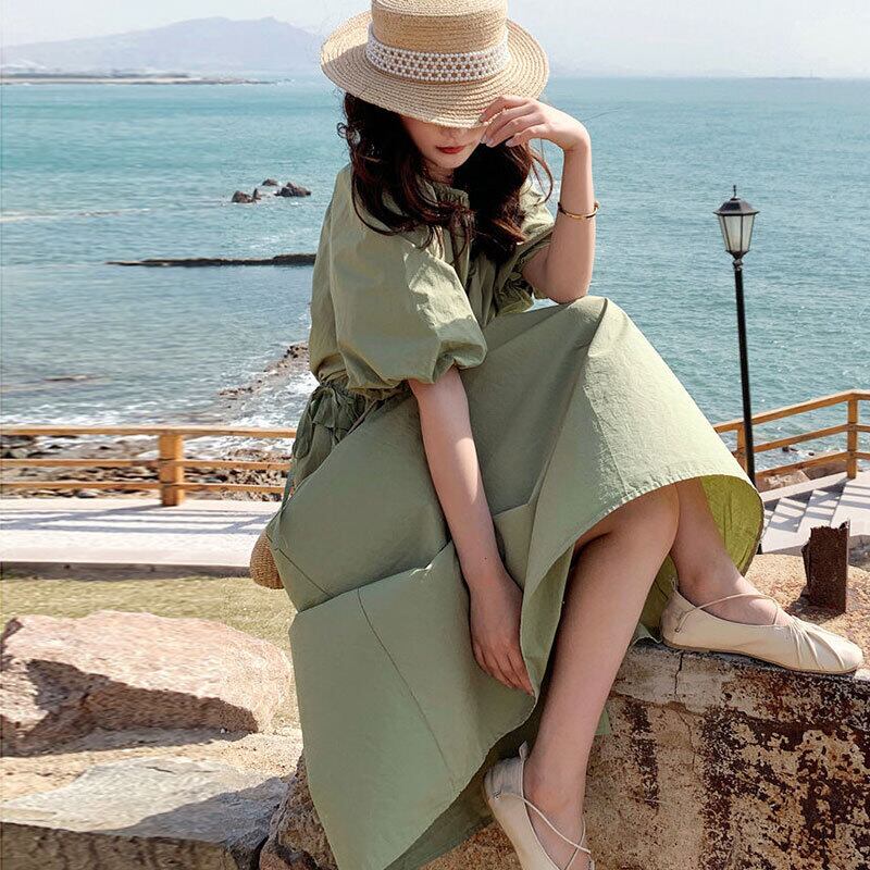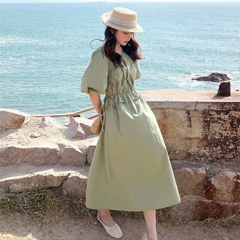 グリーン無地フリル裾切り替えパフスリーブデートワンピース【DL-2737】