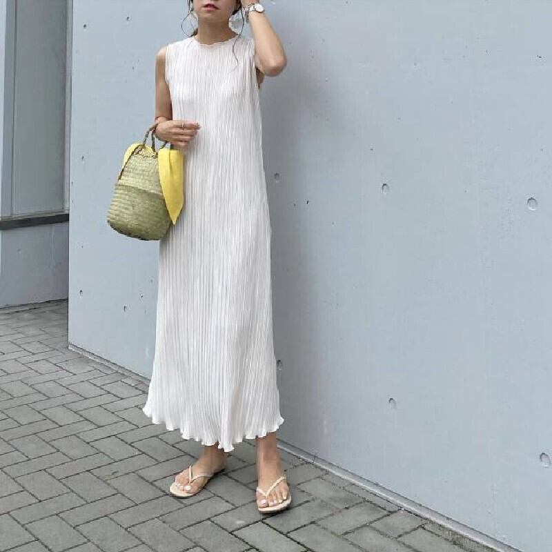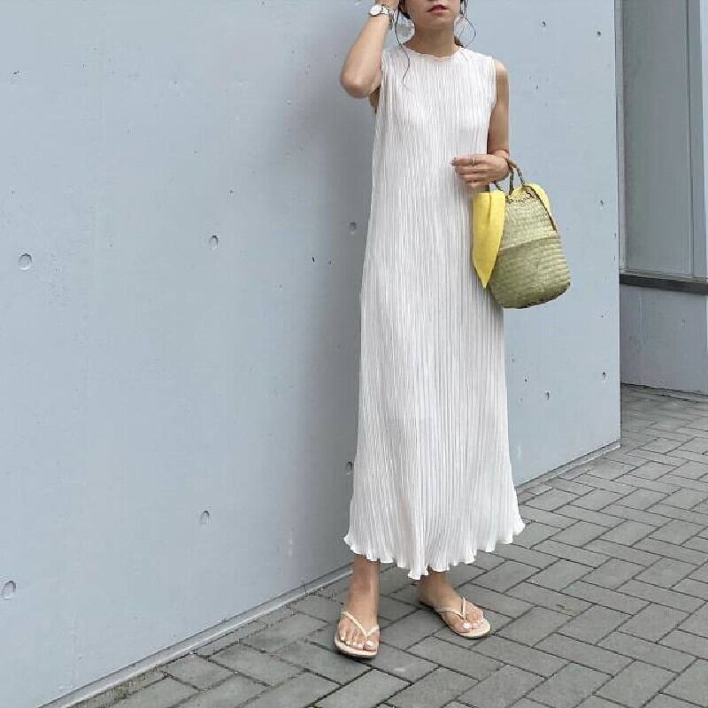 ベージュ無地無袖フリル裾ロングカジュアルワンピース【DL-2759】