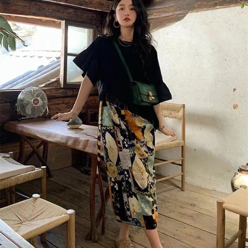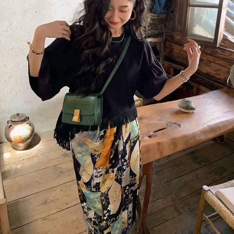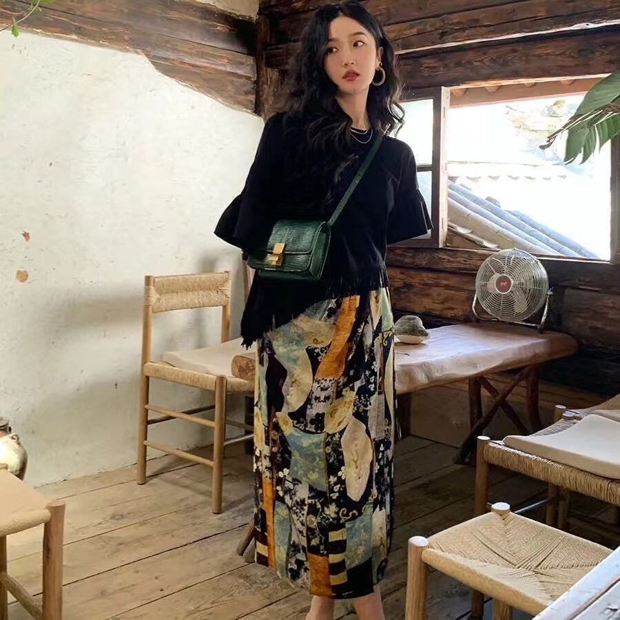 ブラック無地フレンチ袖トップス&花柄ロングスカートセットアップ【DL-2770】