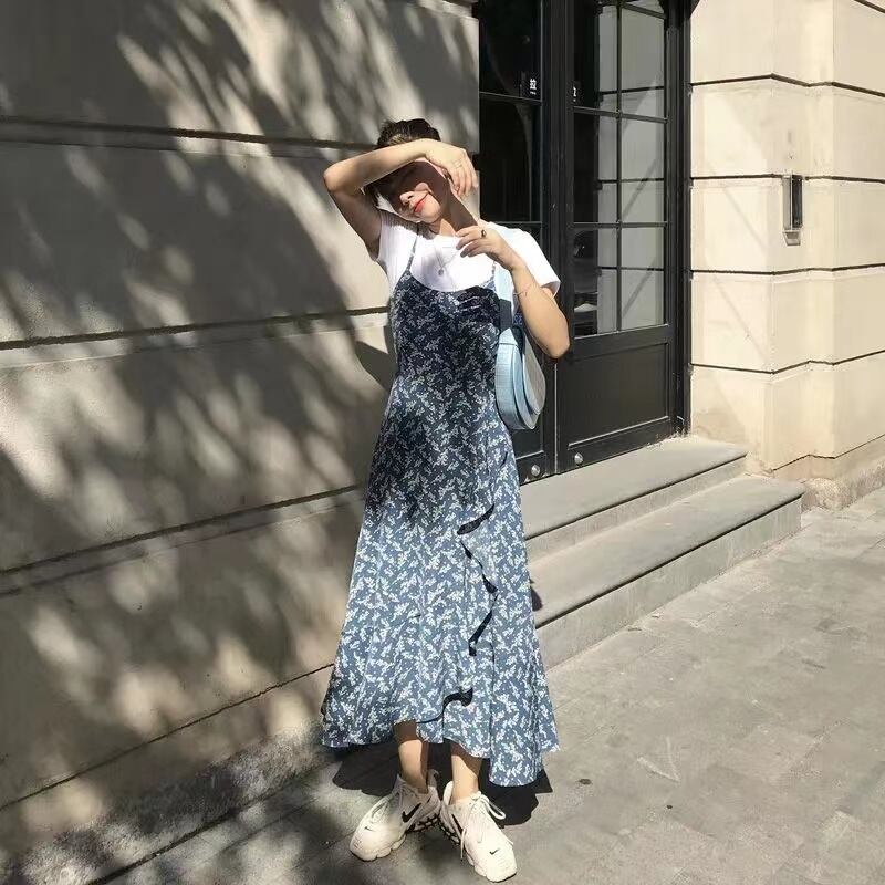 無地Tシャツトップス&小柄花柄フリル裾ロングカジュアルワンピースセットアップ【DL-2775】