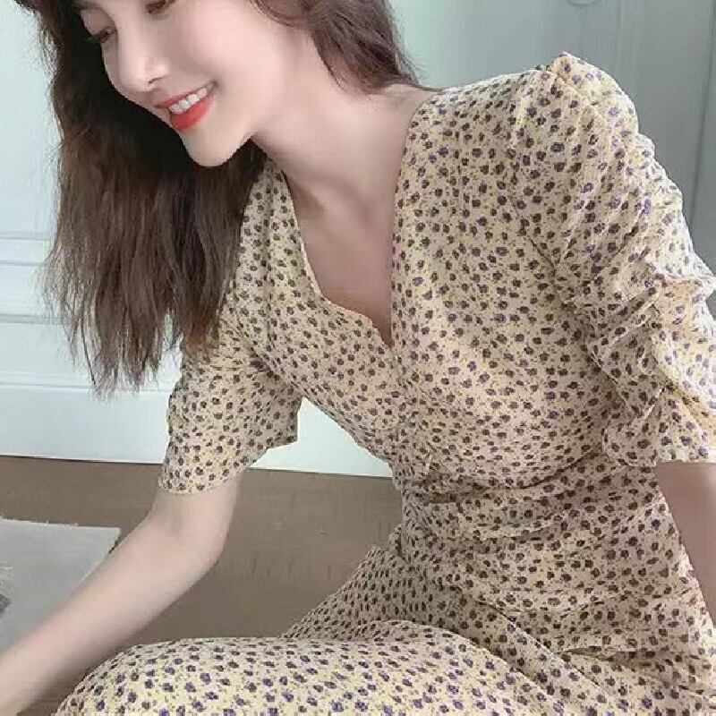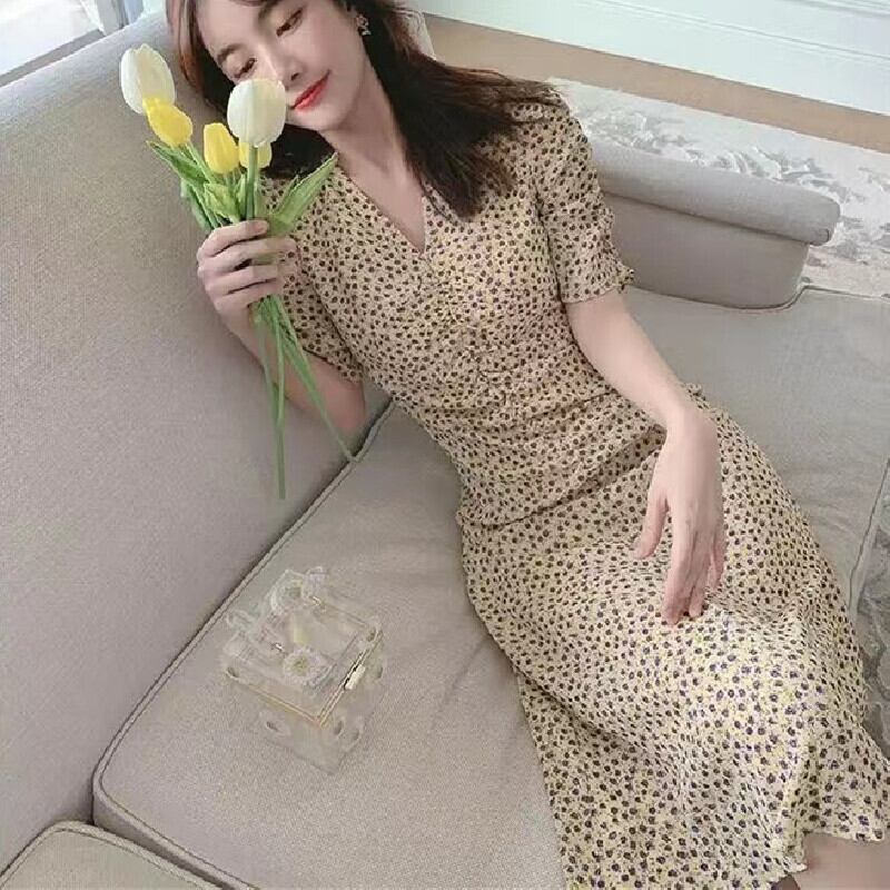 小柄花柄Vネック半袖シフォン着痩せ効果デートワンピース【DL-2777】