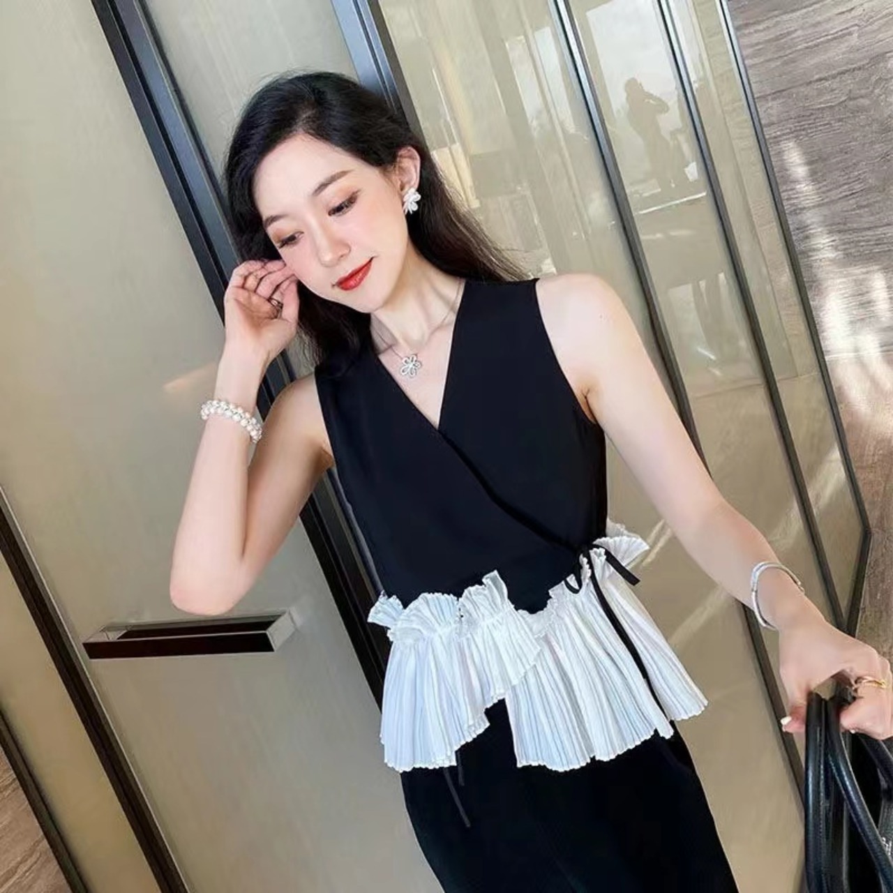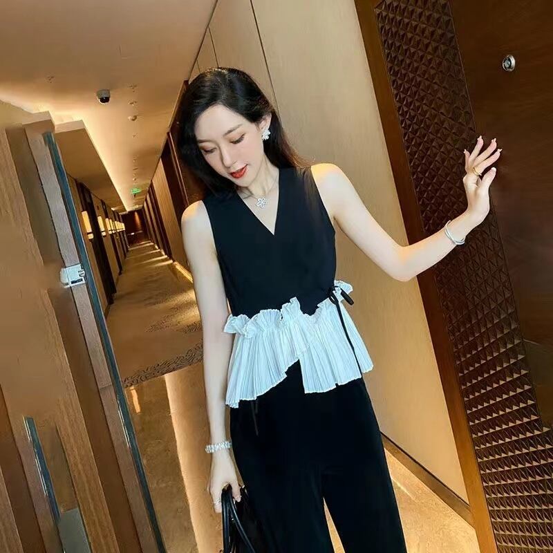 フリル裾切り替え無袖ベルトトップス&無地ゆったりカジュアルパンツセットアップ【DL-2797】