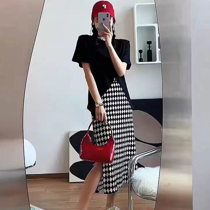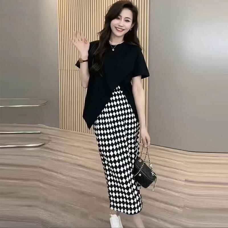 無地スリットトップス&チェック柄スリットスカートセットアップ【DL-2801】