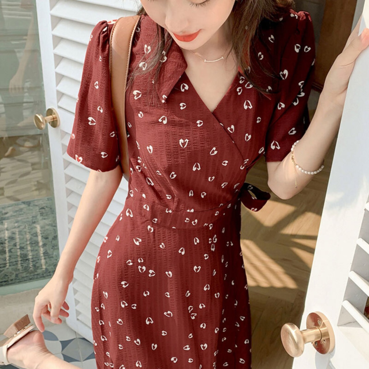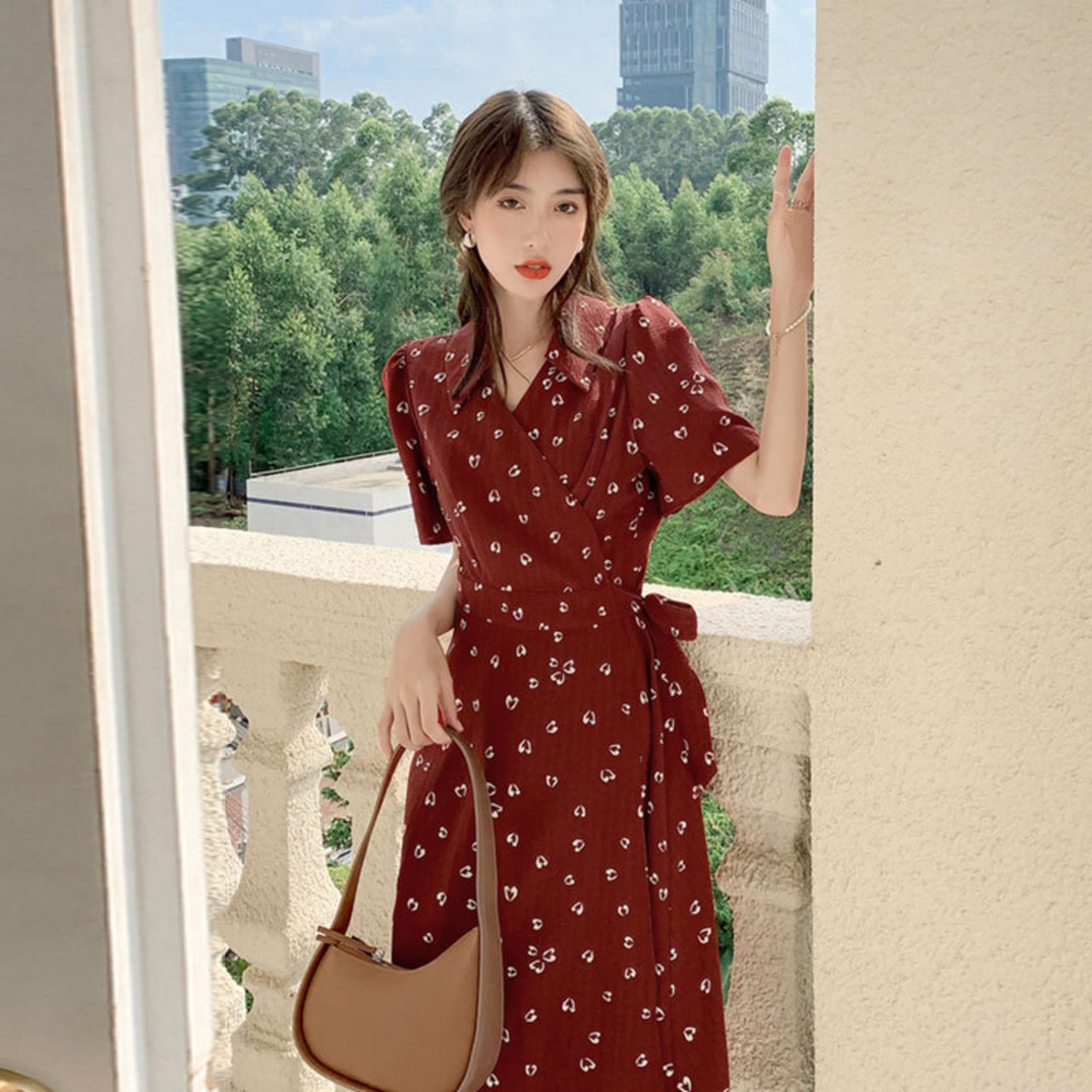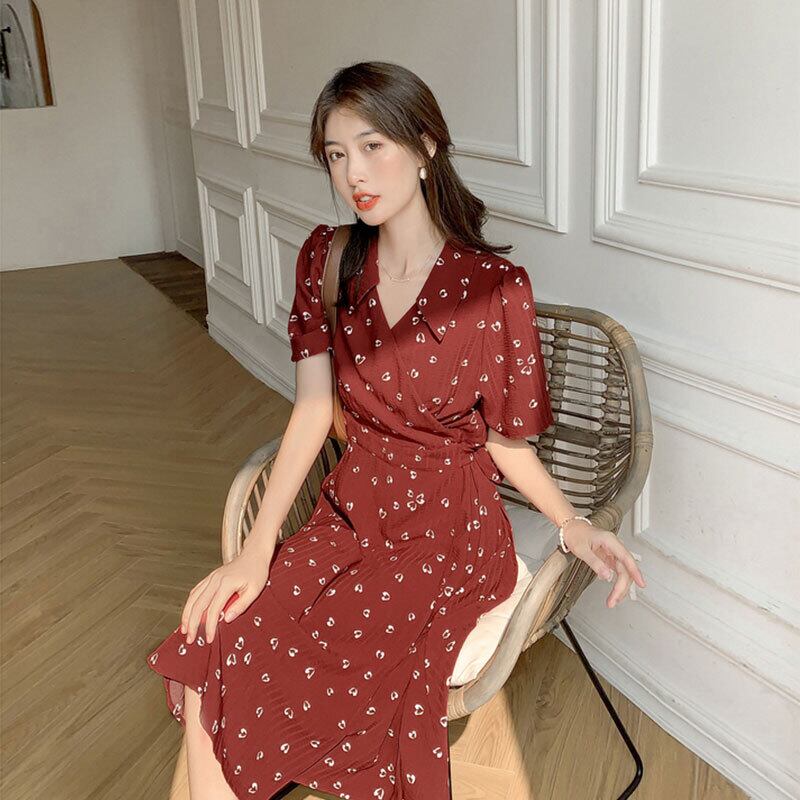 フランスファッションレッド花柄Vネックデートワンピース【DL-2817】