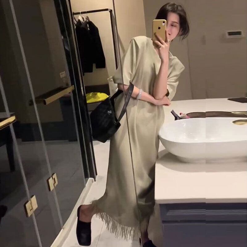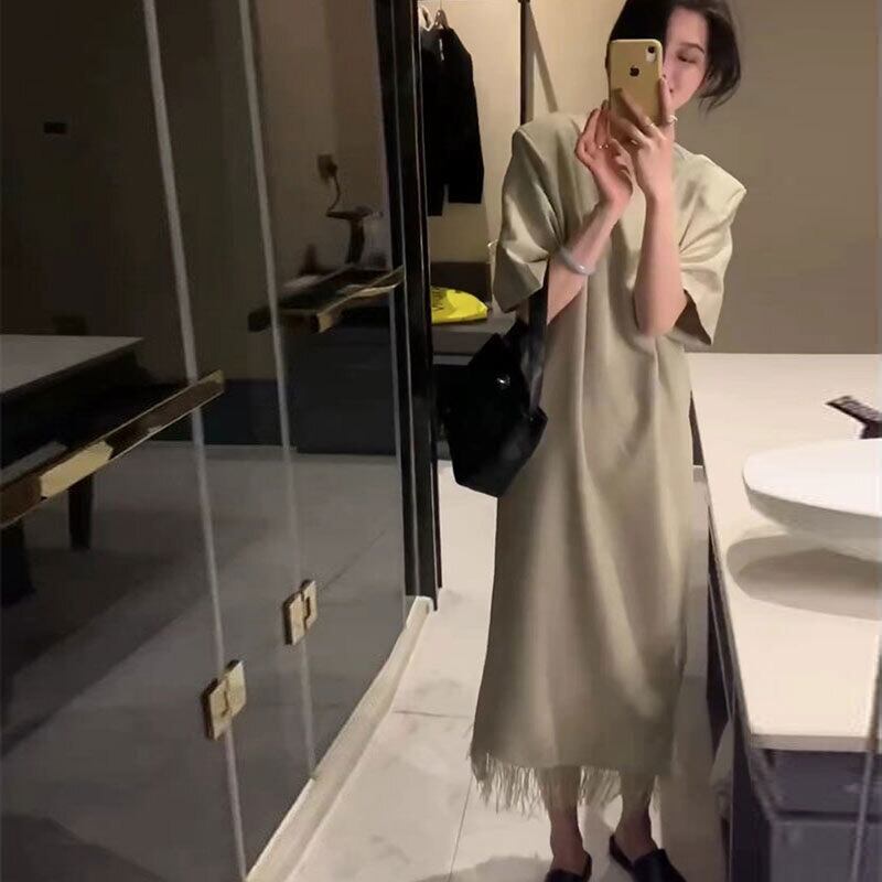 フリンジ裾ラウンドネックゆったりカジュアルワンピース【DL-2825】