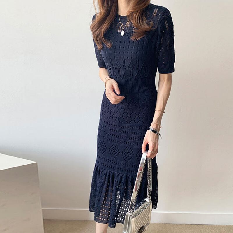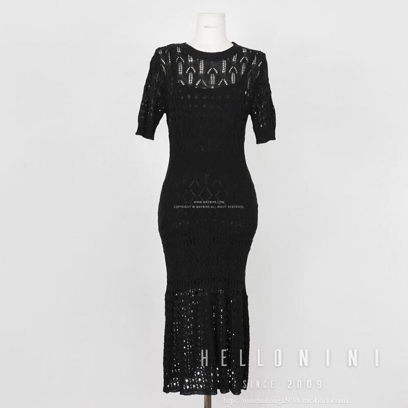 レース透かし彫り無地半袖ニットワンピース&無地スリップカジュアルワンピースセットアップ【DL-2839】