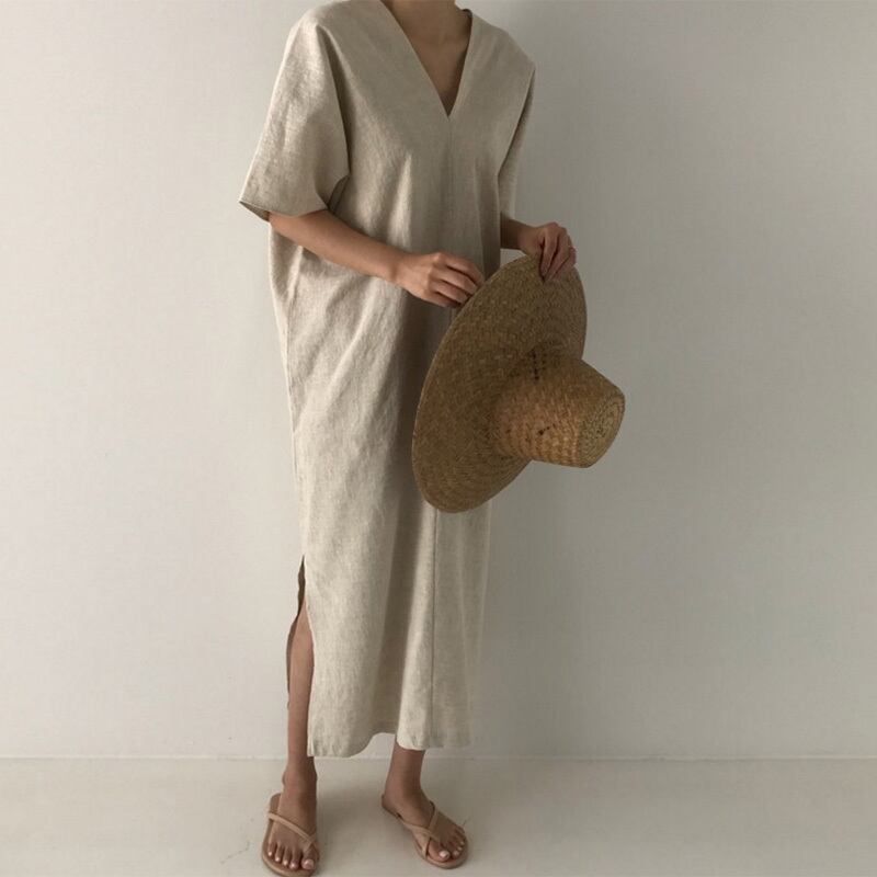 けだるい風気質無地Vネックロングカジュアルワンピース【DL-2841】