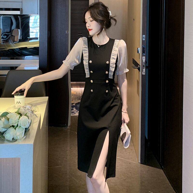 メッシュ切り替えデザインクルーネックスリットデートワンピース【DL-2855】