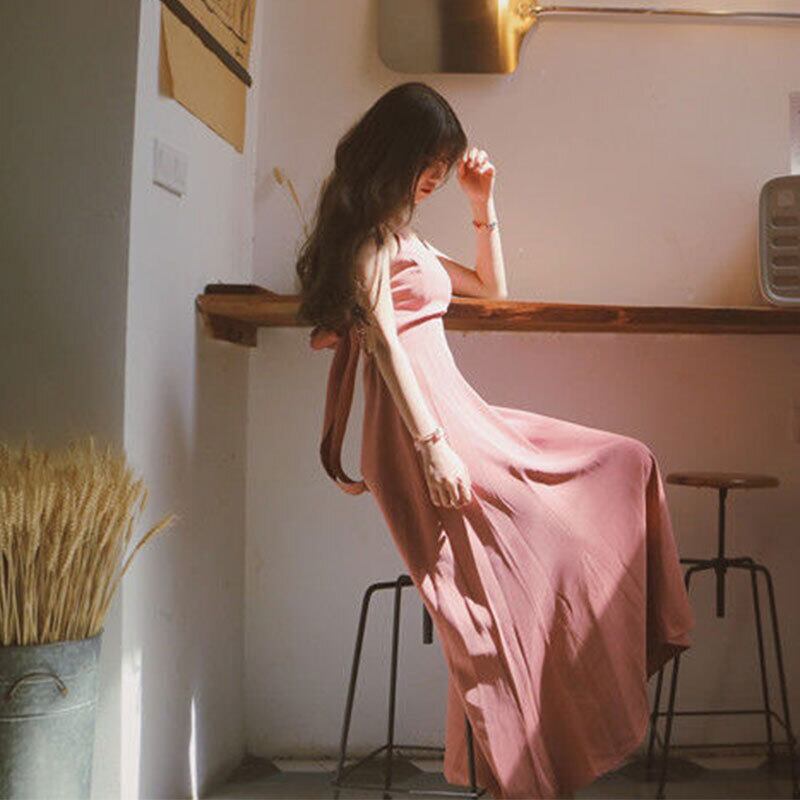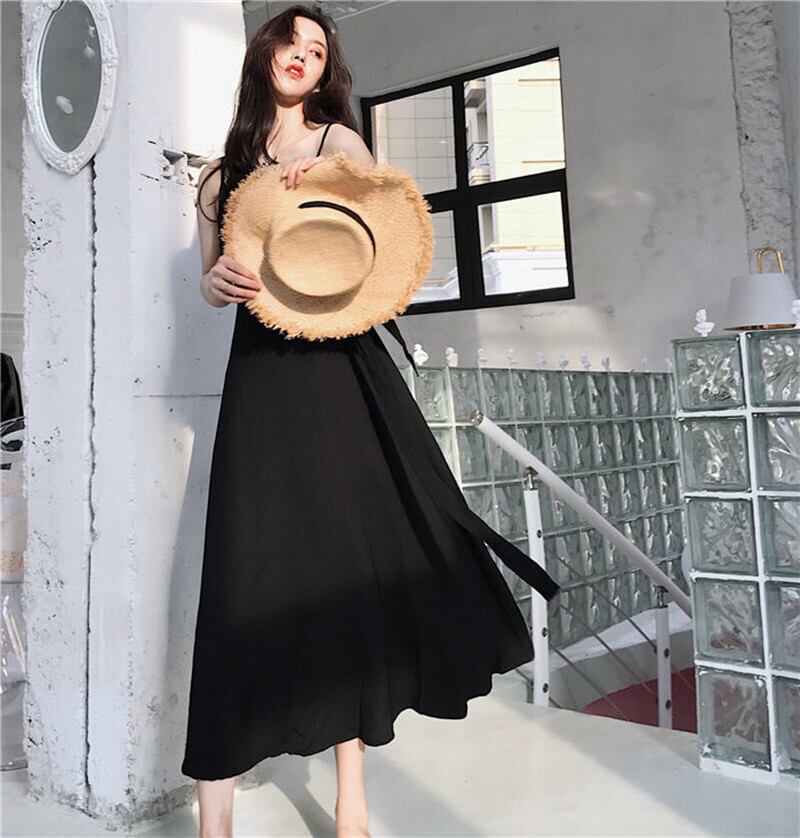 蝶結び付きハイウエストサスペンダーロングデートワンピース【DL-2856】