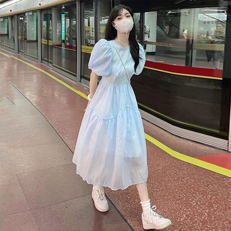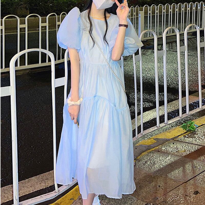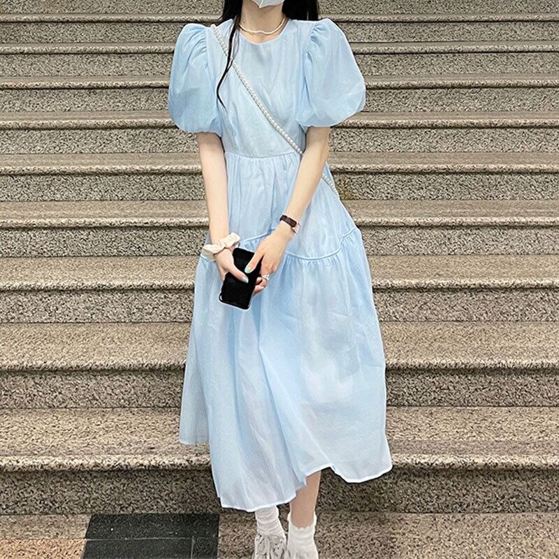 ブルー無地パフスリーブゆったりデートワンピース【DL-2857】