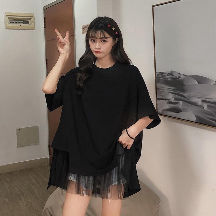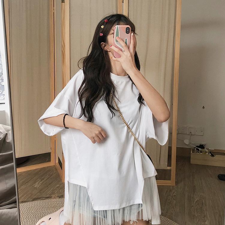 フリル裾メッシュ不規則切り替えデザインTシャツトップス【DL-2870】