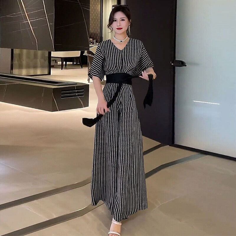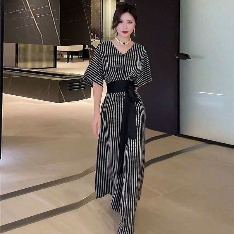 ストライプゆったりVネックトップス&ハイウエストワイドレッグパンツセットアップ【DL-2883】