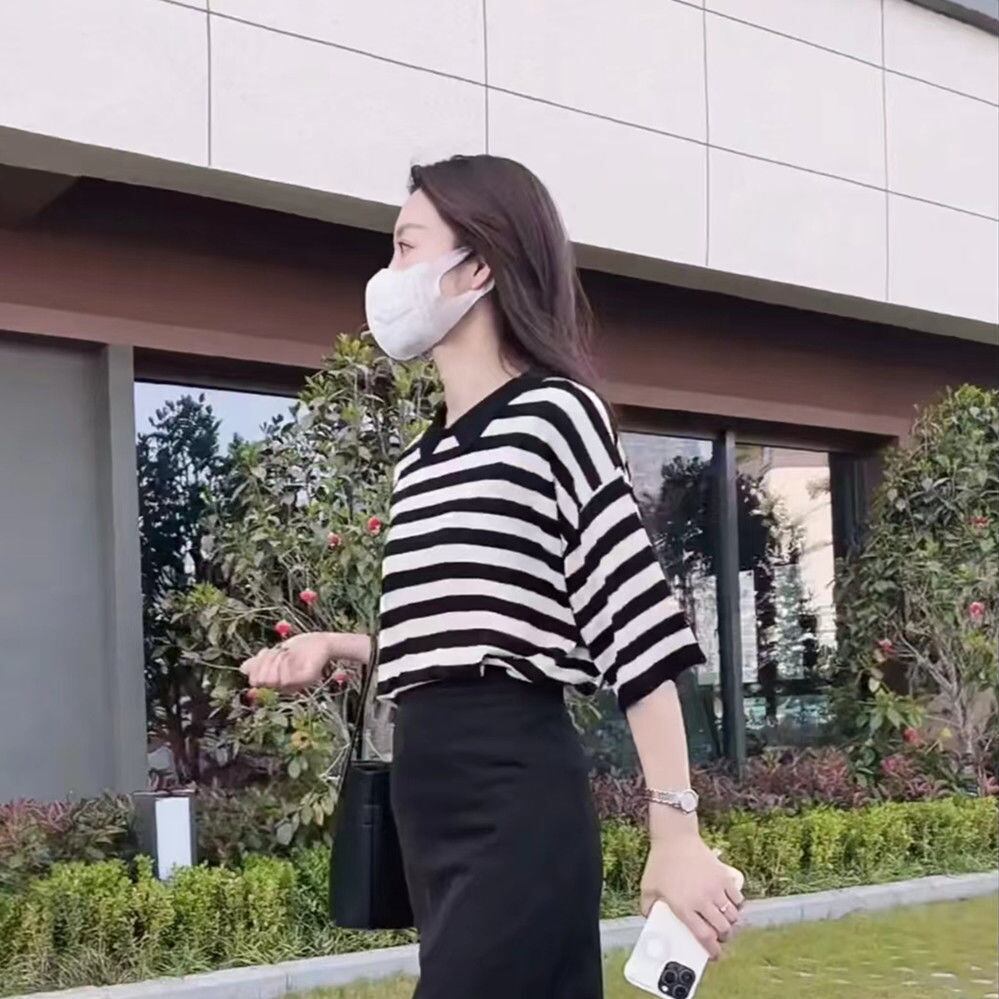 ストライプゆったりTシャツトップス&無地スリットロングスカート【DL-2886】