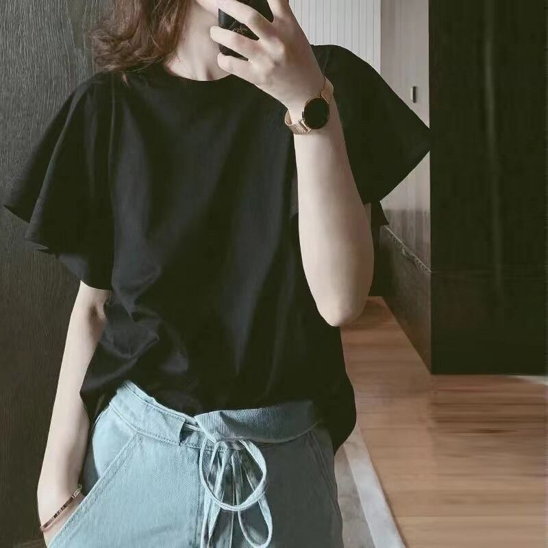 フランスファッションフリル裾袖無地Tシャツトップス【DL-2887】