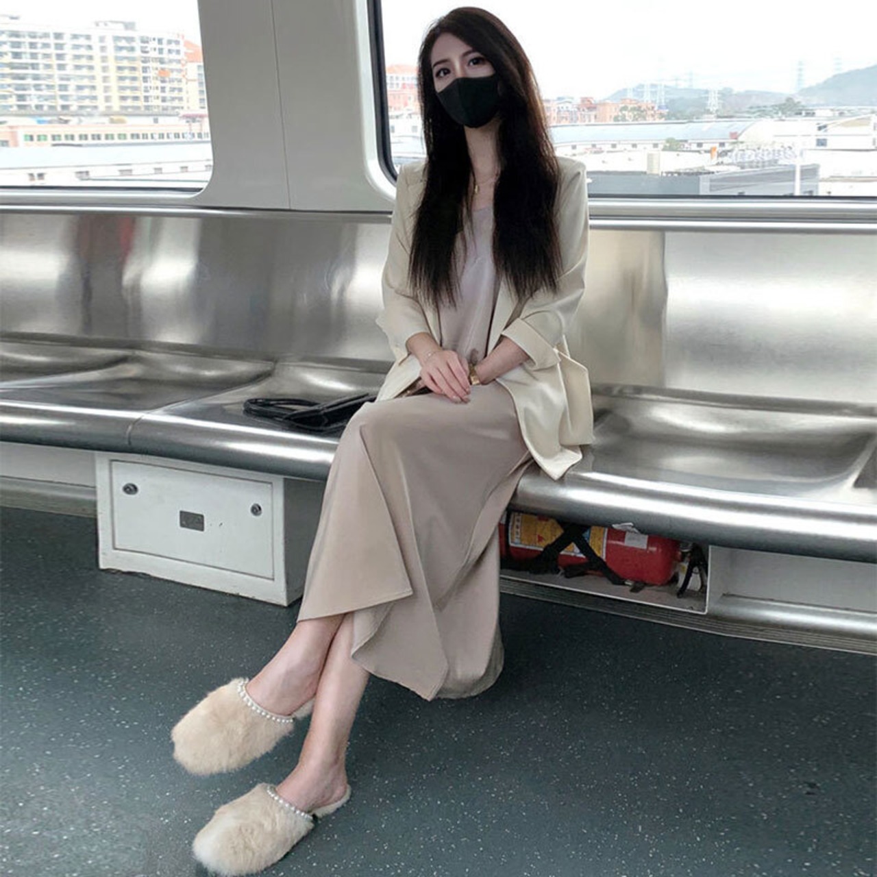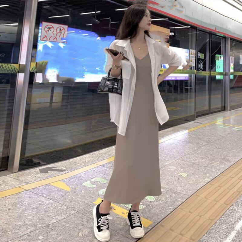 高級感無地シャツ·ブラウスアウター&スリップカジュアルワンピースセットアップ【DL-2892】