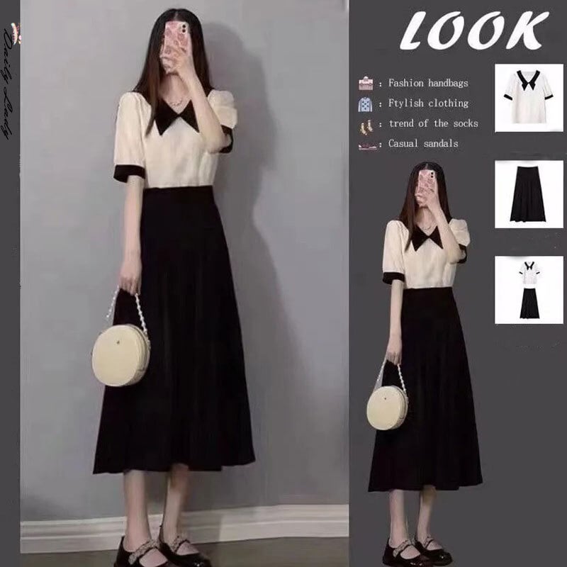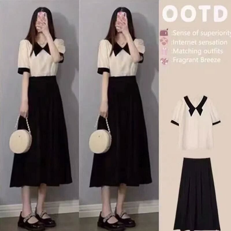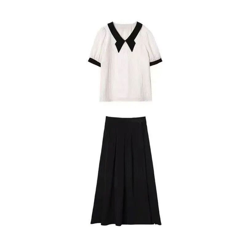 半袖配色切り替えシャツ·ブラウス&ブラック無地ロングスカートセットアップ【DL-2896】