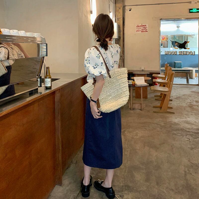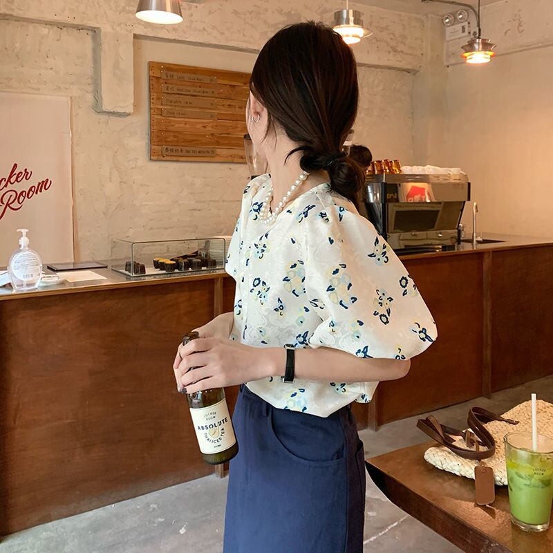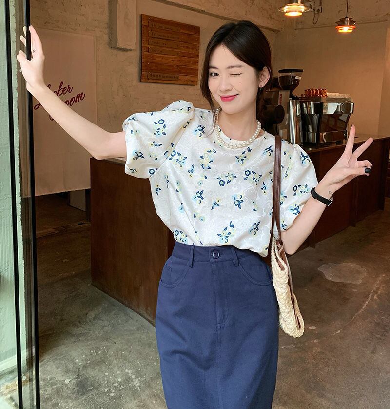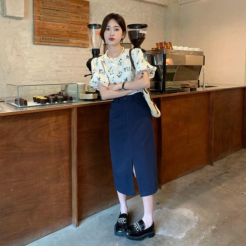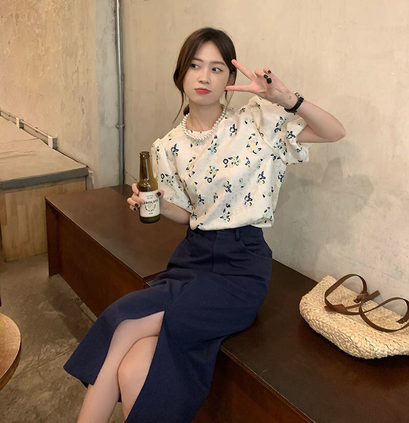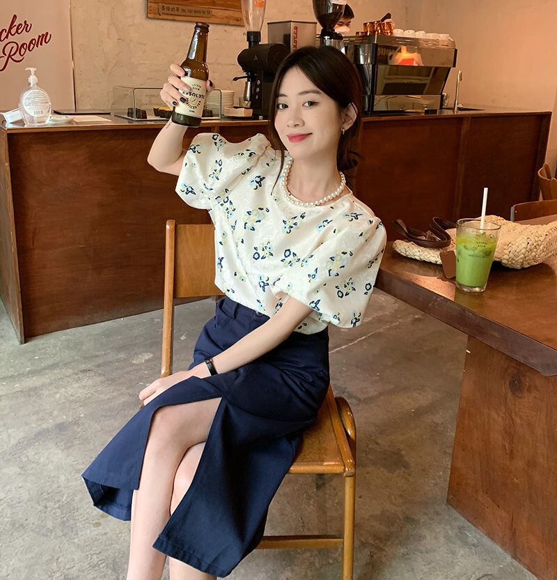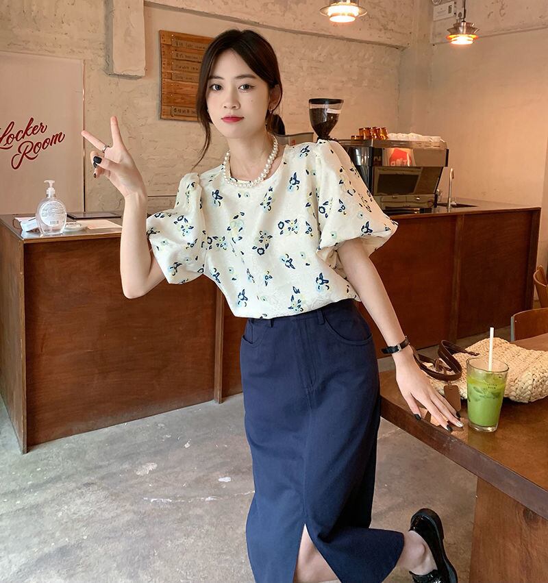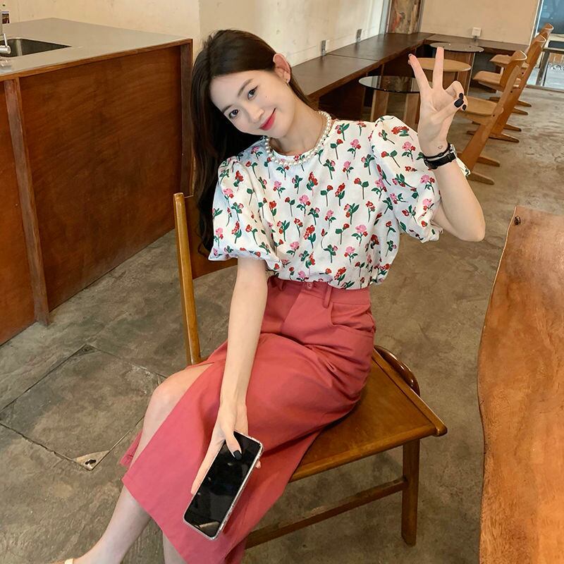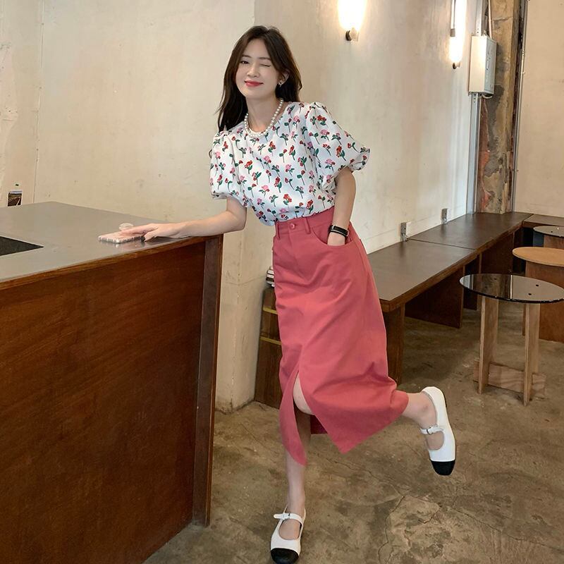 花柄パフスリーブラウンドネックトップス&スリットスカートセットアップ【DL-2898】
