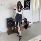 字母プリントコーデしやすいTシャツ&不規則スリットスカートセットアップ【DL-2904】