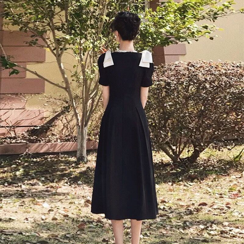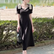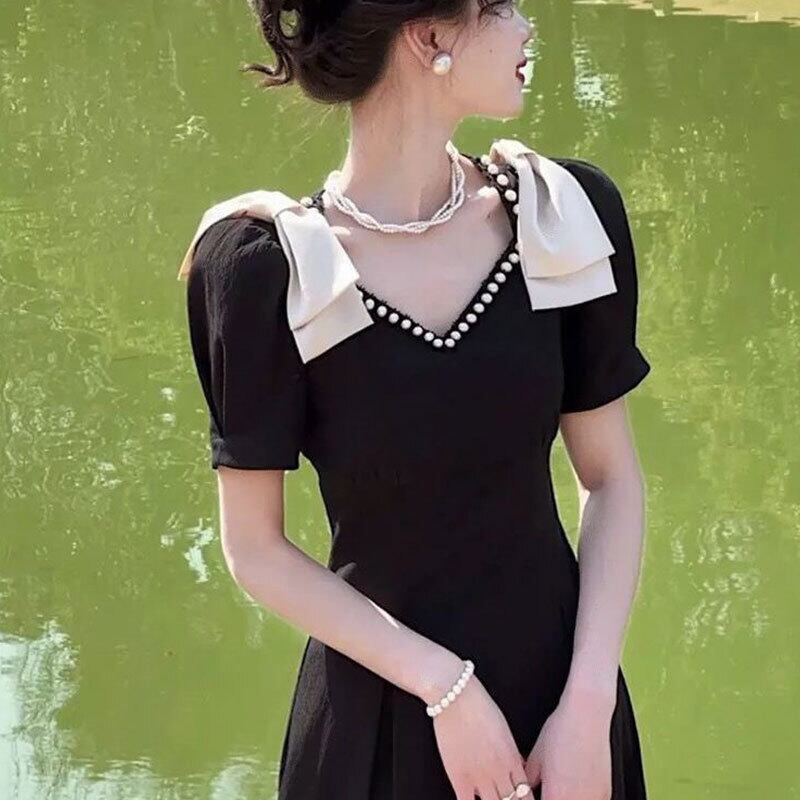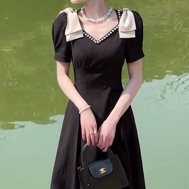 フランスファッション蝶結びパール飾るロングデートワンピース【DL-2911】