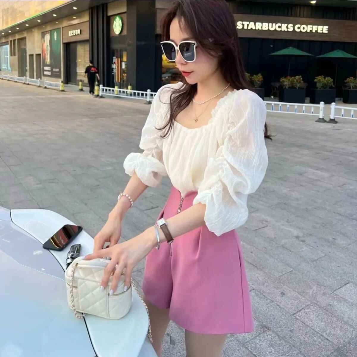 フランスシャツ·ブラウストップス&ピンク無地ショーツセットアップ【DL-2917】