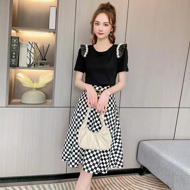 フレンチ袖ニットセータートップス&チェック柄スカートセットアップ【DL-2918】